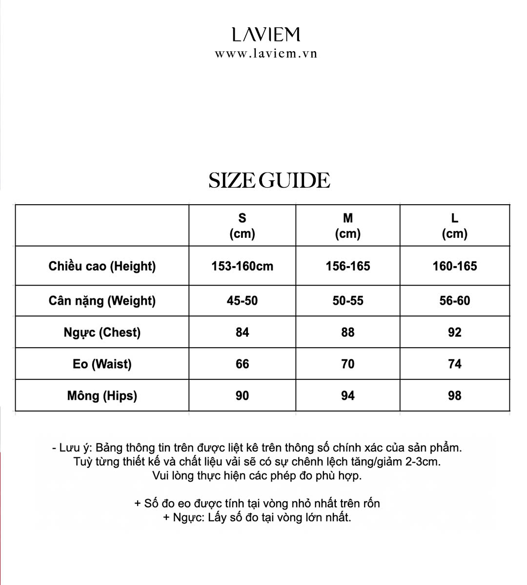 Lưu ý: - Bảng size chart chỉ mang tính chất tham khảo, tùy thuộc vào số đo cơ thể & chất liệu vải khác nhau sẽ có sự chênh lệch nhất định.