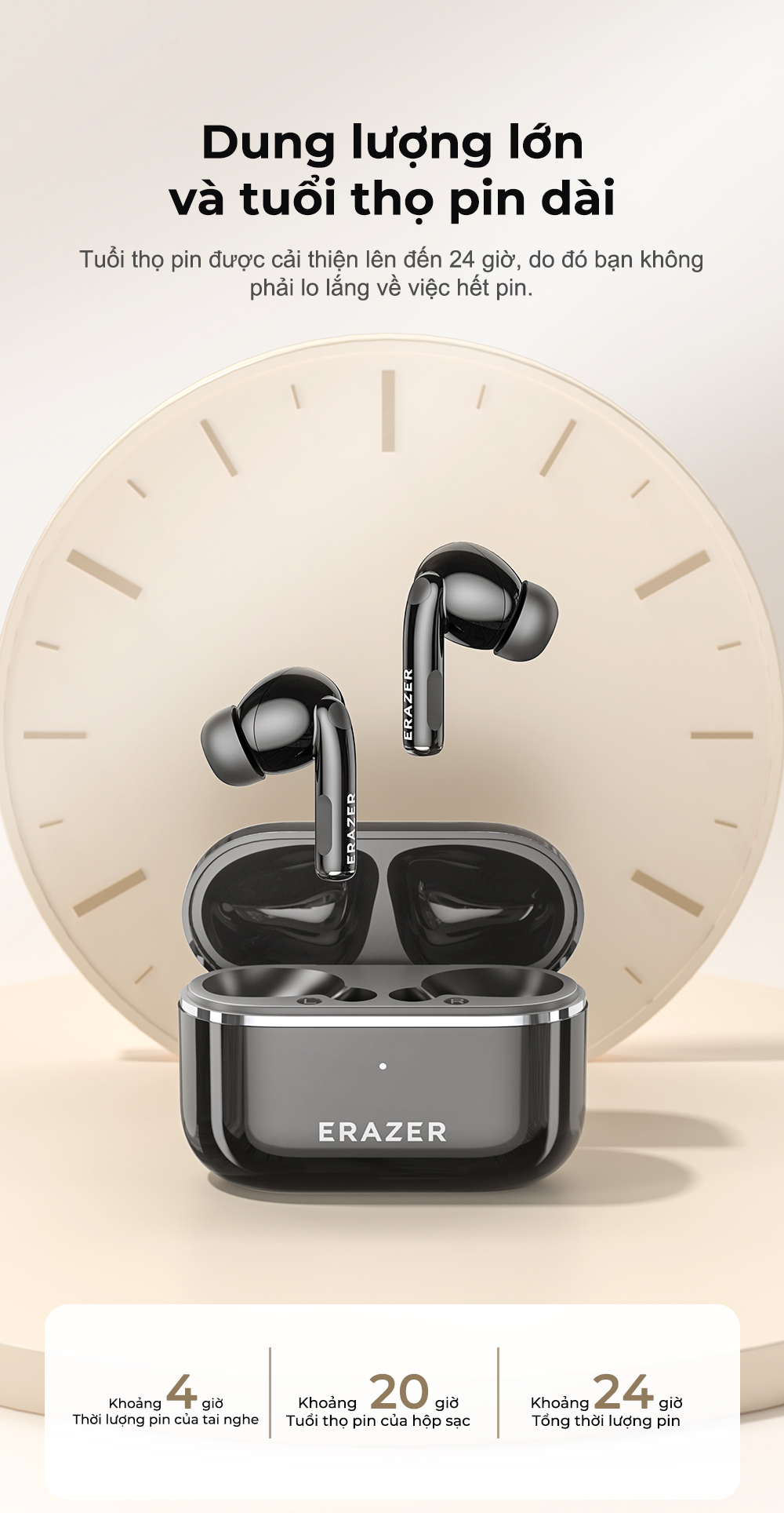 Thời lượng pin được tăng lên đến 24 giờ, không cần lo lắng về việc hết điện