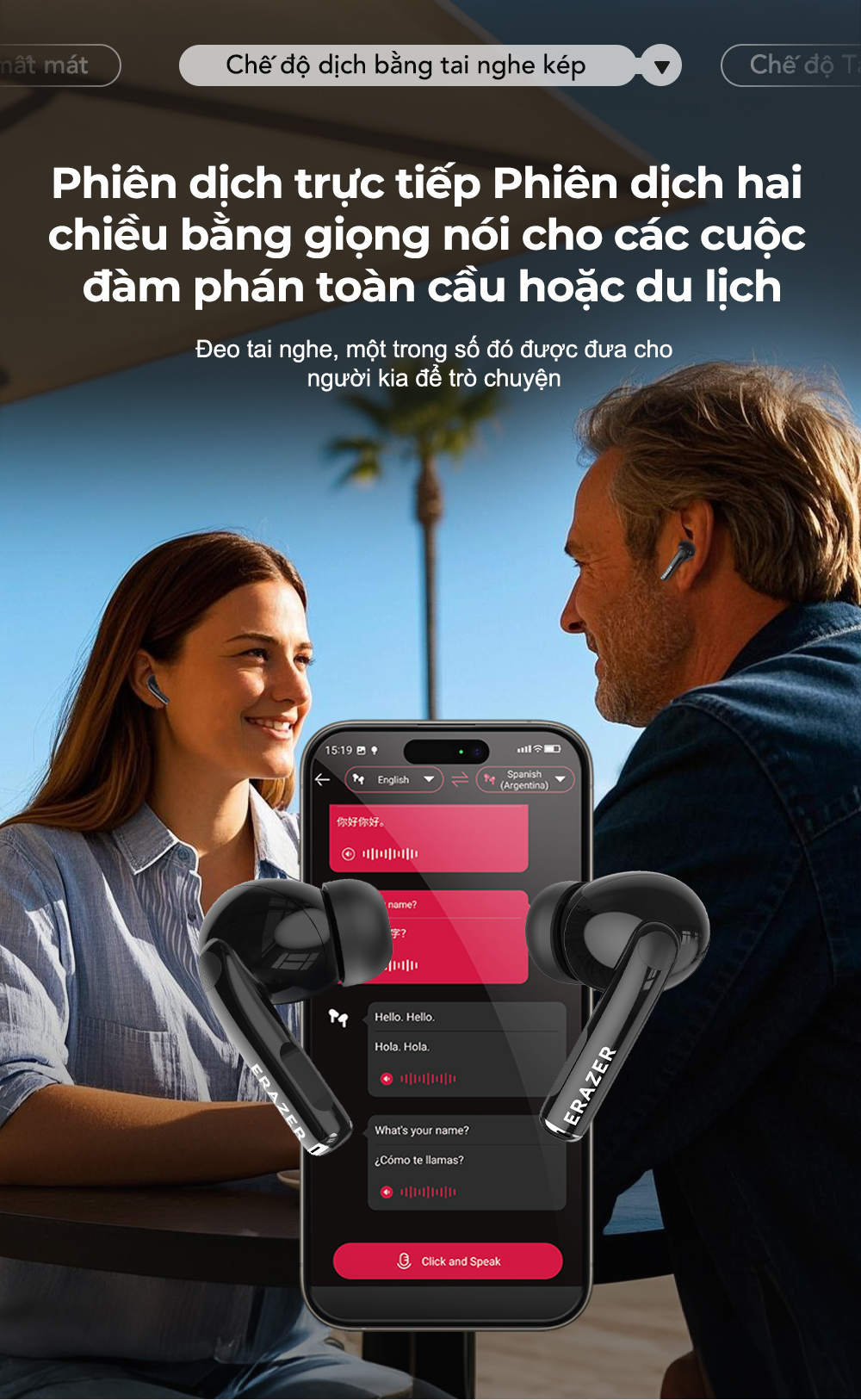 Đeo tai nghe ở một bên và giữ điện thoại ở bên kia. Bên kia nói tiếng nước ngoài và tai nghe dịch ngay lập tức
