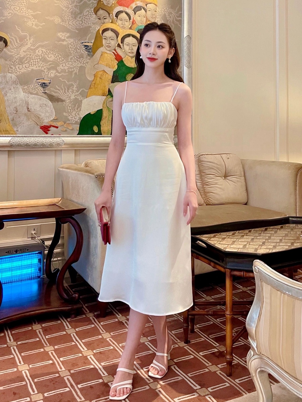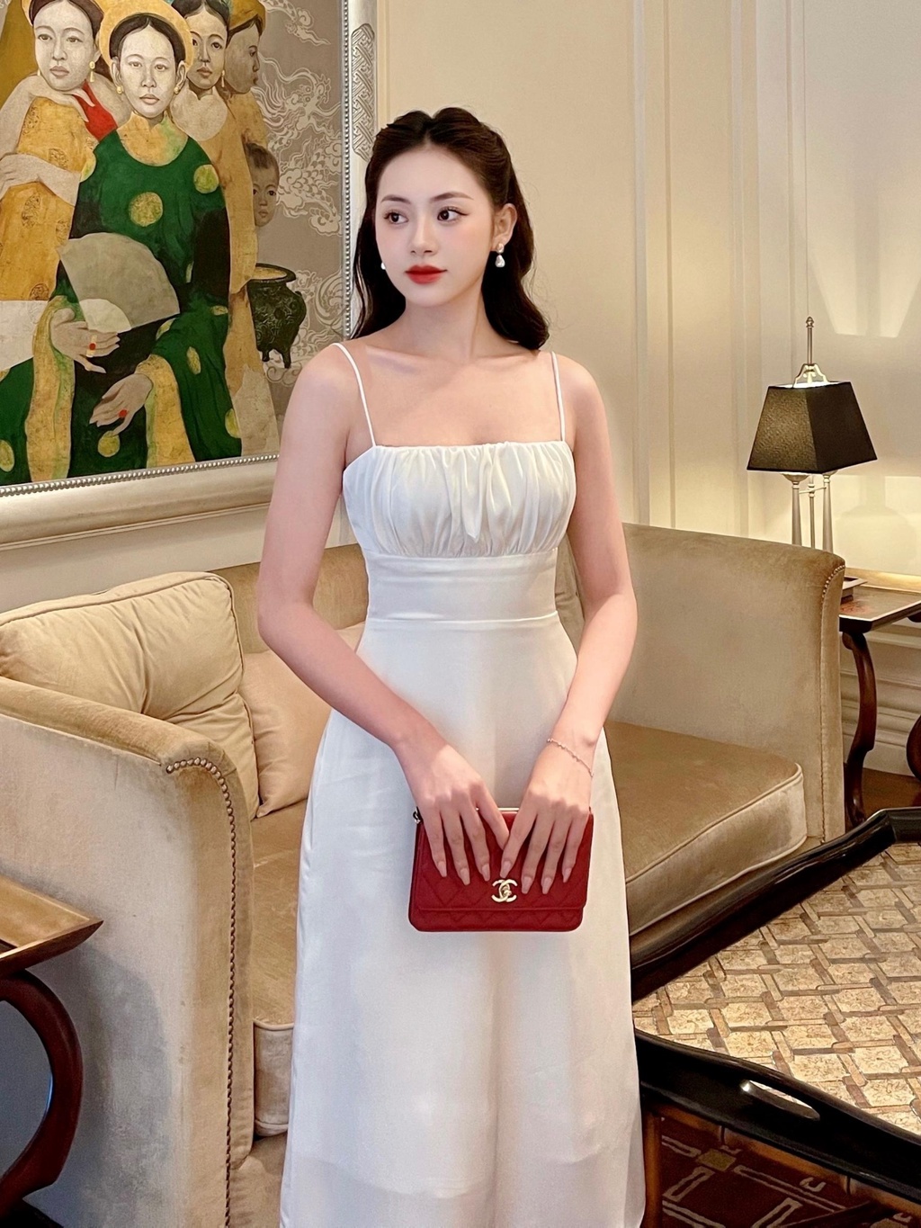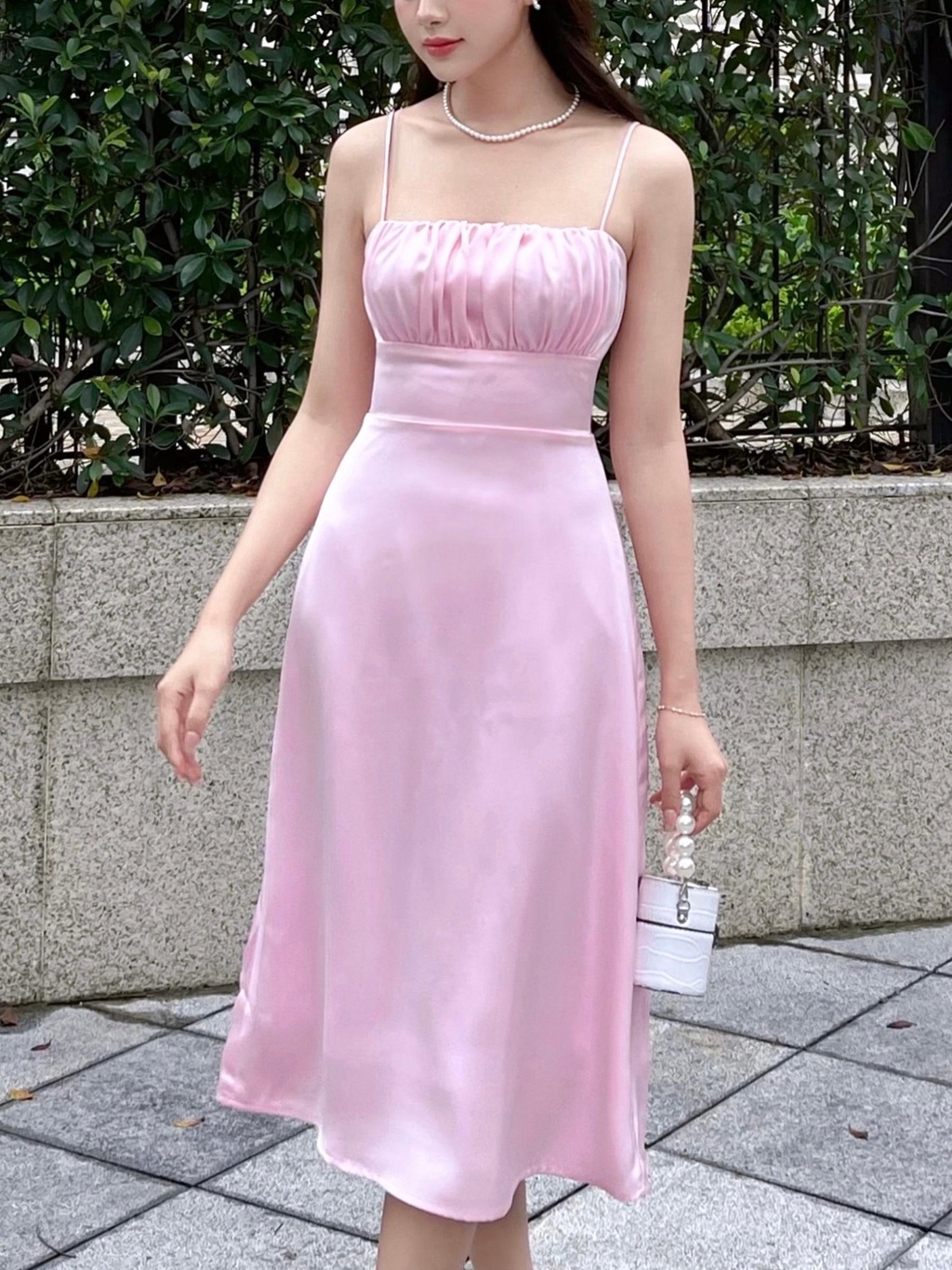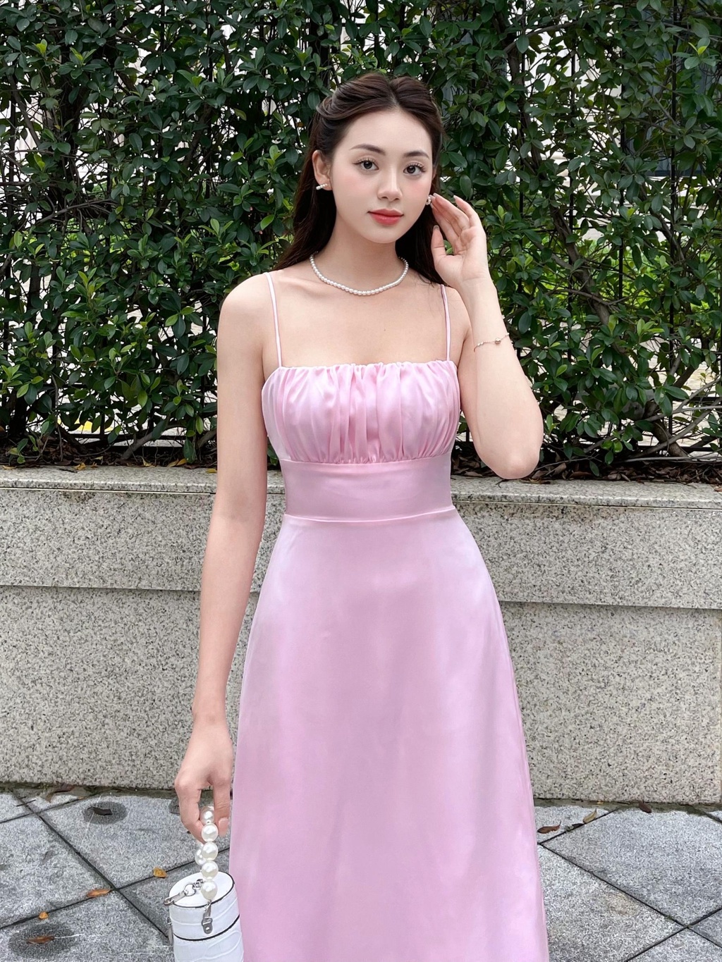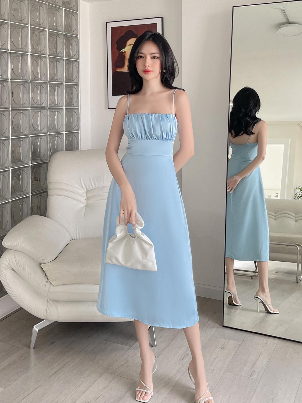 - Đặc điểm: Cổ vuông, hai dây, kiểu ngún bèo ngực, dáng dài