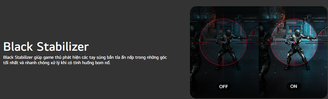 Người dùng có thể kích hoạt Overclock để tăng tần số quét cùng Motion Blur Reduction giúp hạn chế nhòe hình trong các chuyển động nhanh. Khi giải trí, các tính năng như Black Stabilizer, Crosshair, Dynamic Action Sync và FPS Counter hỗ trợ quan sát tốt hơn.
