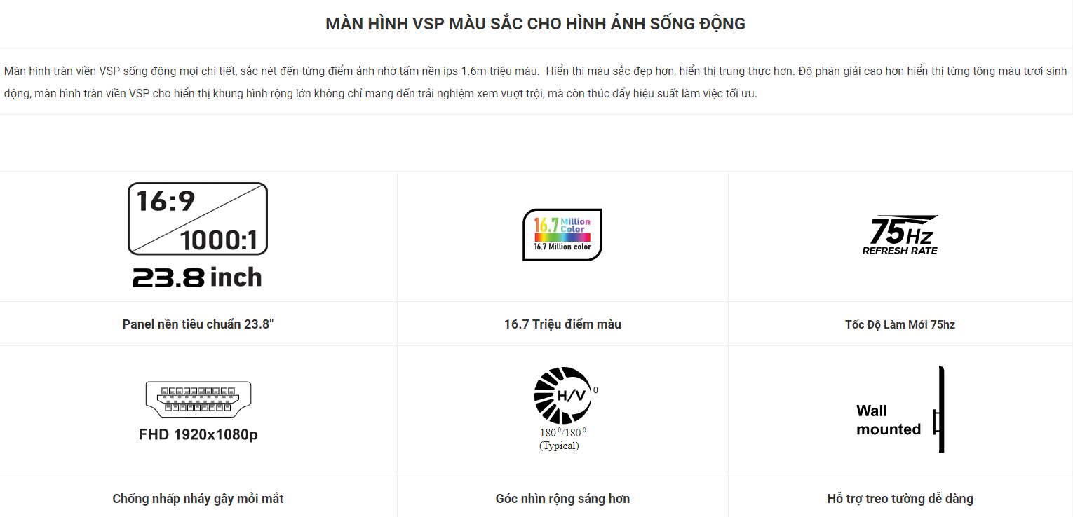 Màn hình máy tính VSP V2407S / VC241i | 23.8" / IPS / Full HD / 75Hz / 5ms / VGA & HDMI | Bảo hành 3 năm