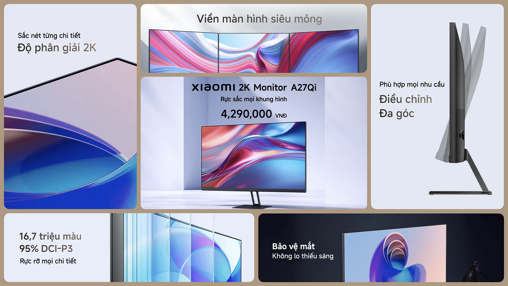 Sở hữu độ phân giải QHD (2560x1440), màn hình Xiaomi A27Qi (ELA5812EU) mang đến chất lượng hình ảnh sắc nét gấp 1.77 lần so với Full HD, đảm bảo hiển thị chi tiết rõ ràng hơn. Khả năng hiển thị 16.7 triệu màu cùng độ phủ màu rộng giúp hình ảnh trở nên sống động, chân thực, đặc biệt hữu ích cho những ai làm việc liên quan đến thiết kế đồ họa hay chỉnh sửa hình ảnh.