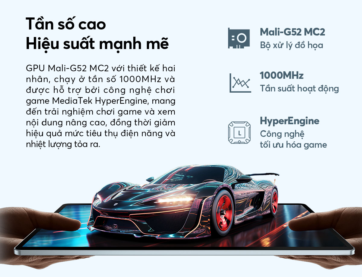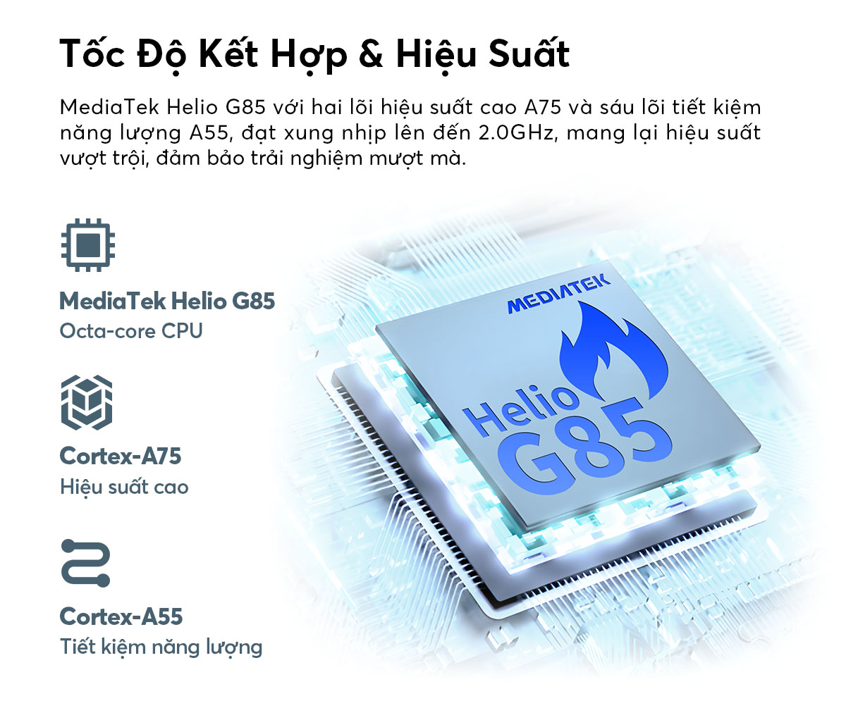 [Hiệu Suất Mạnh Mẽ] Được trang bị bộ vi xử lý tám nhân MediaTek Helio G85 và GPU Mali-G52 MC2, mang lại hiệu suất mượt mà và hình ảnh ấn tượng.