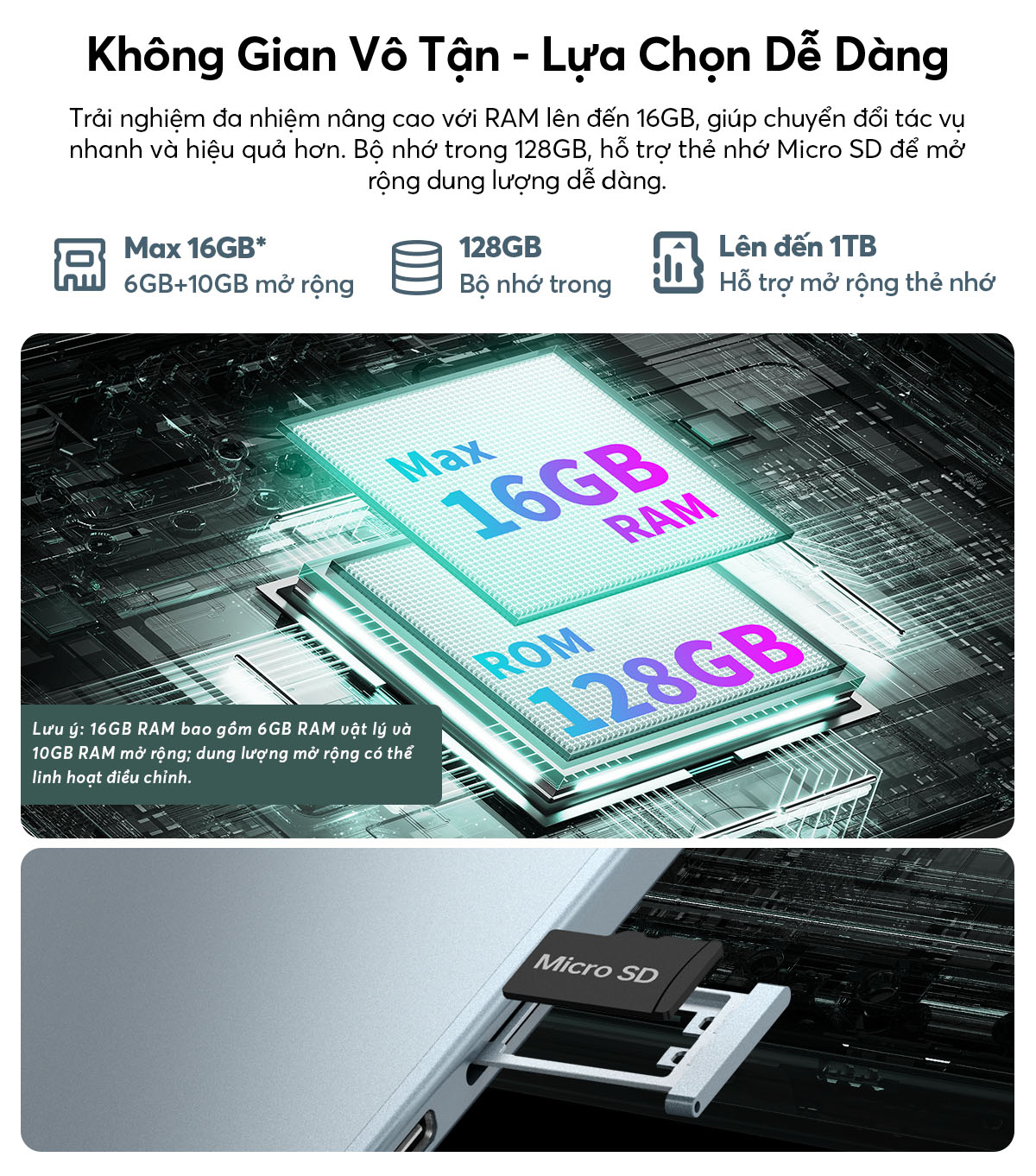 [Bộ Nhớ Dung Lượng Cao] Đi kèm RAM 6GB, có thể mở rộng thêm 10GB RAM ảo, cùng bộ nhớ trong 128GB, giúp đa nhiệm mượt mà và có đủ không gian lưu trữ.