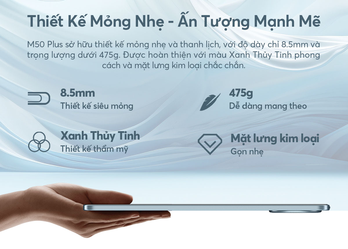 [Thiết Kế Thanh Lịch] Với lớp hoàn thiện màu 'Xanh Thủy Tinh', độ mỏng chỉ 8.5mm và trọng lượng 475g, dễ dàng mang theo để làm việc hoặc giải trí mọi lúc, mọi nơi.