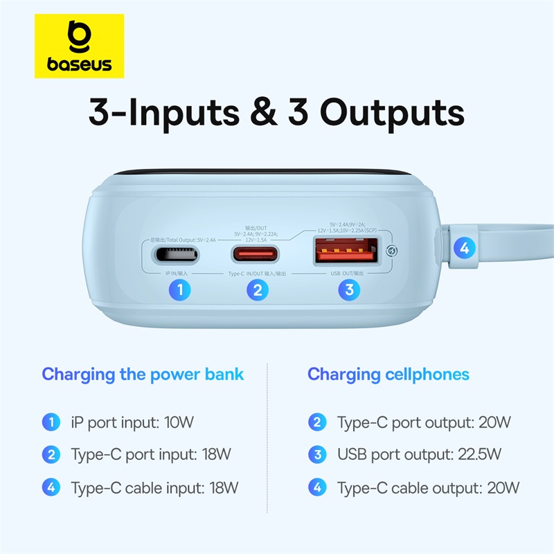 [MỚI] Sạc dự phòng 4 cổng Baseus Qpow Pro+10000 mAh/20000mAh 22.5W-Sạc nhanh Type-C tích hợp cáp và màn hình kỹ thuật số