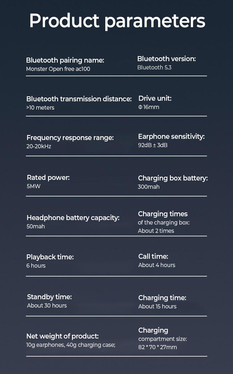 Mở hộp sạc, lấy hai tai nghe ra và nó sẽ tự động bật nguồn. Sau vài giây, tai nghe bên trái và bên phải sẽ tự động được kết nối và sau đó bạn có thể nghe thấy lời nhắc bằng giọng nói "Ghép nối". Để kết nối thiết bị mới, vui lòng bật thiết bị Bluetooth và tìm kiếm "Monster Open FreeAC100" để kết nối, sau khi ghép nối thành công, bạn sẽ nghe thấy lời nhắc bằng giọng nói "Đã kết nối". Nếu tai nghe đã được ghép nối trước đó, tai nghe sẽ cố gắng kết nối với thiết bị cuối cùng khi được bật.