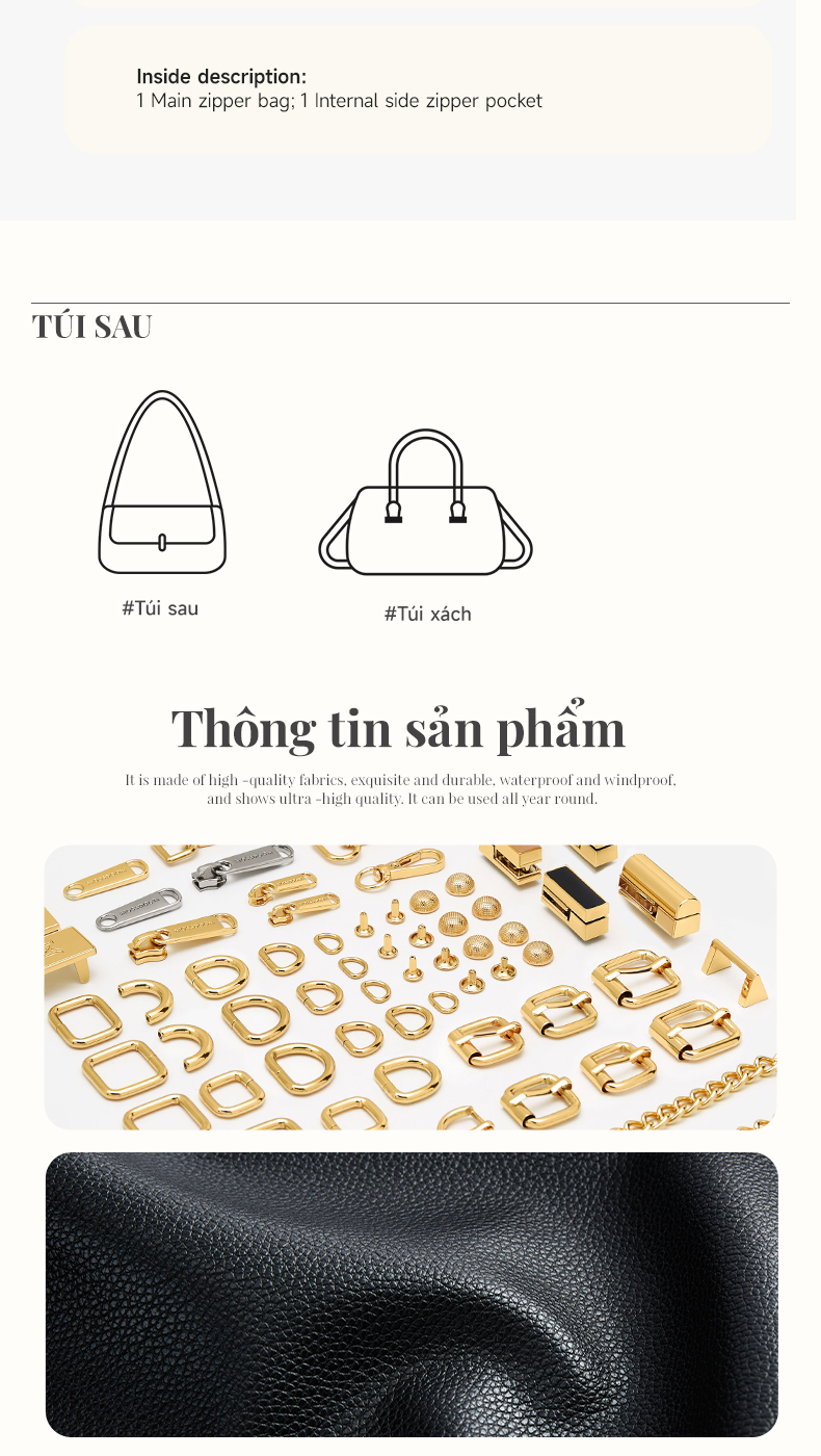 - Bên trong: 1 * Túi khóa kéo sau, chiều cao dây đeo vai khoảng 26cm