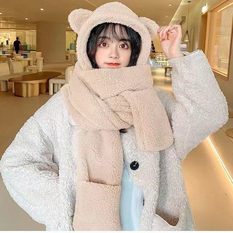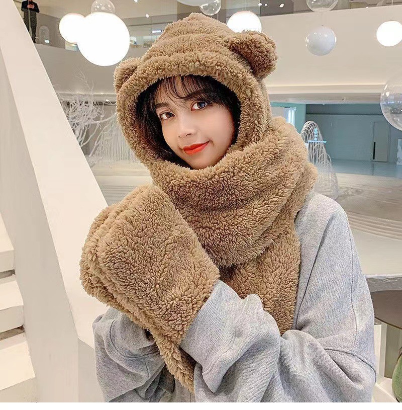 Mũ lông tai gấu kèm khăn quàng cổ bao tay 3 trong 1 ấm áp