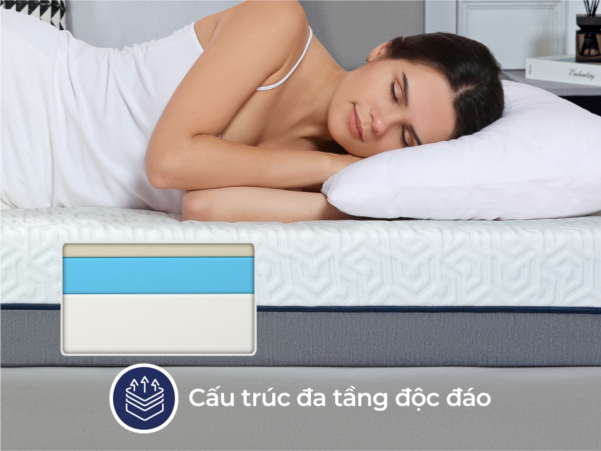 - Cấu trúc đa tầng hạn chế xẹp lún và ôm trọn đường cong tự nhiên của cơ thể.
