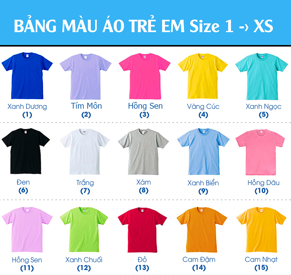 * Size Trẻ Em Từ 1 đến size XS (Có 16 màu)