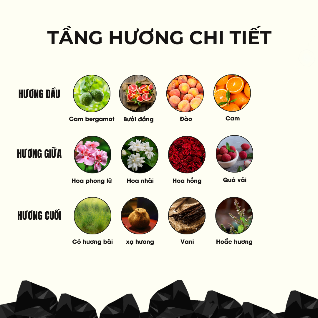 - Hương đầu: Cam bergamot, Hương bưởi, Hương đào, Hương cam