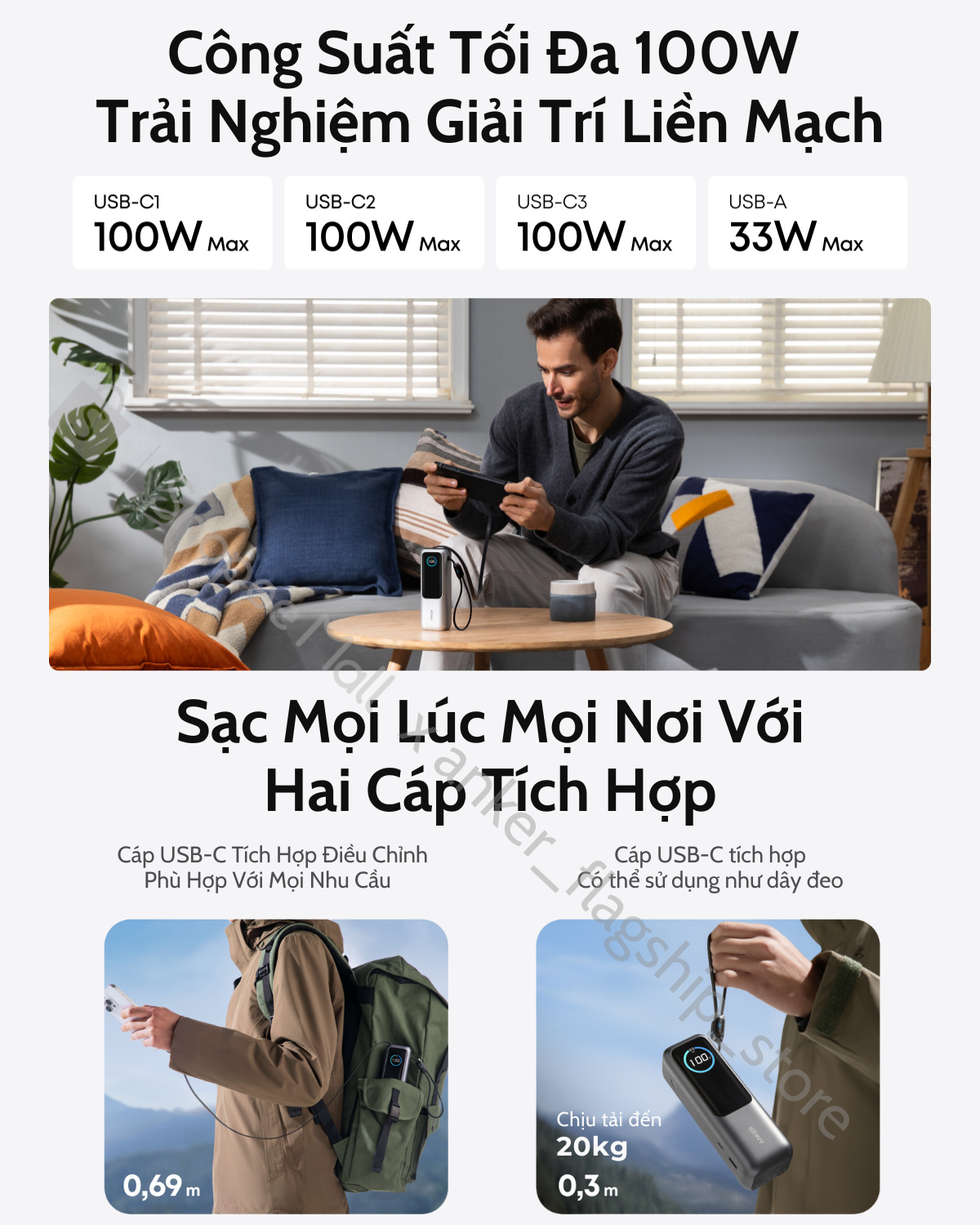Cổng USB-C: Công suất tối đa 100W, hoàn hảo để sạc laptop hoặc các thiết bị cao cấp.