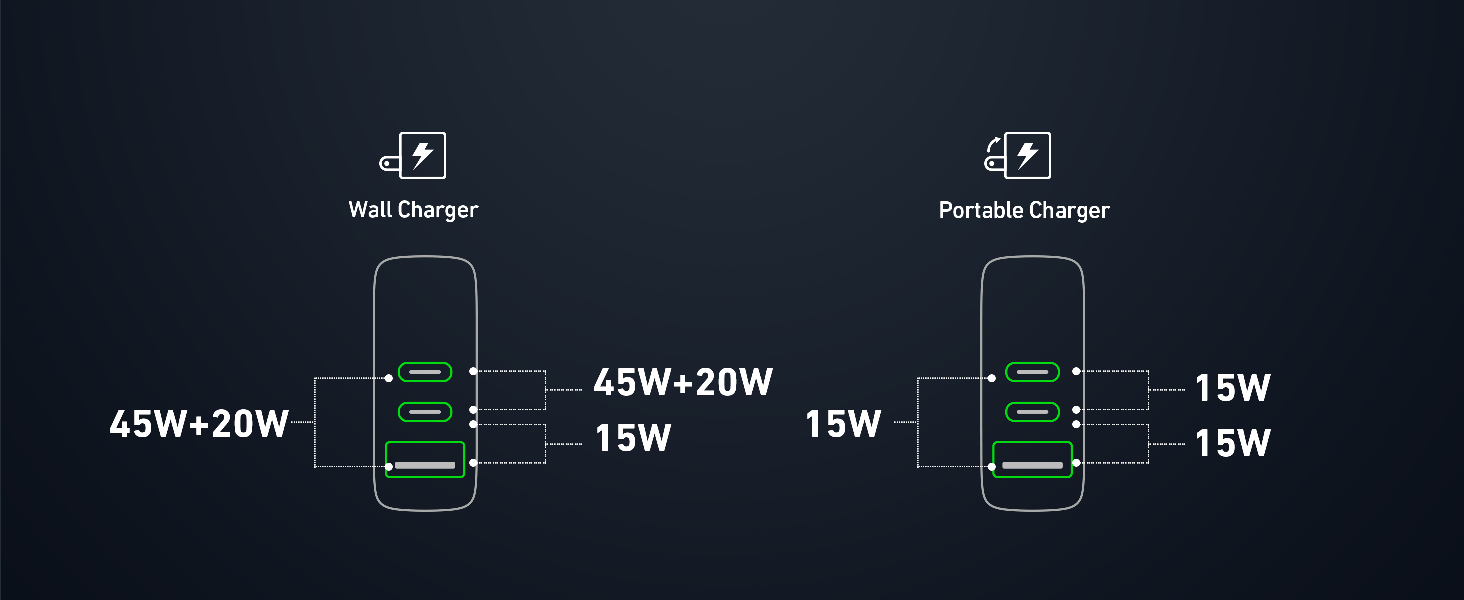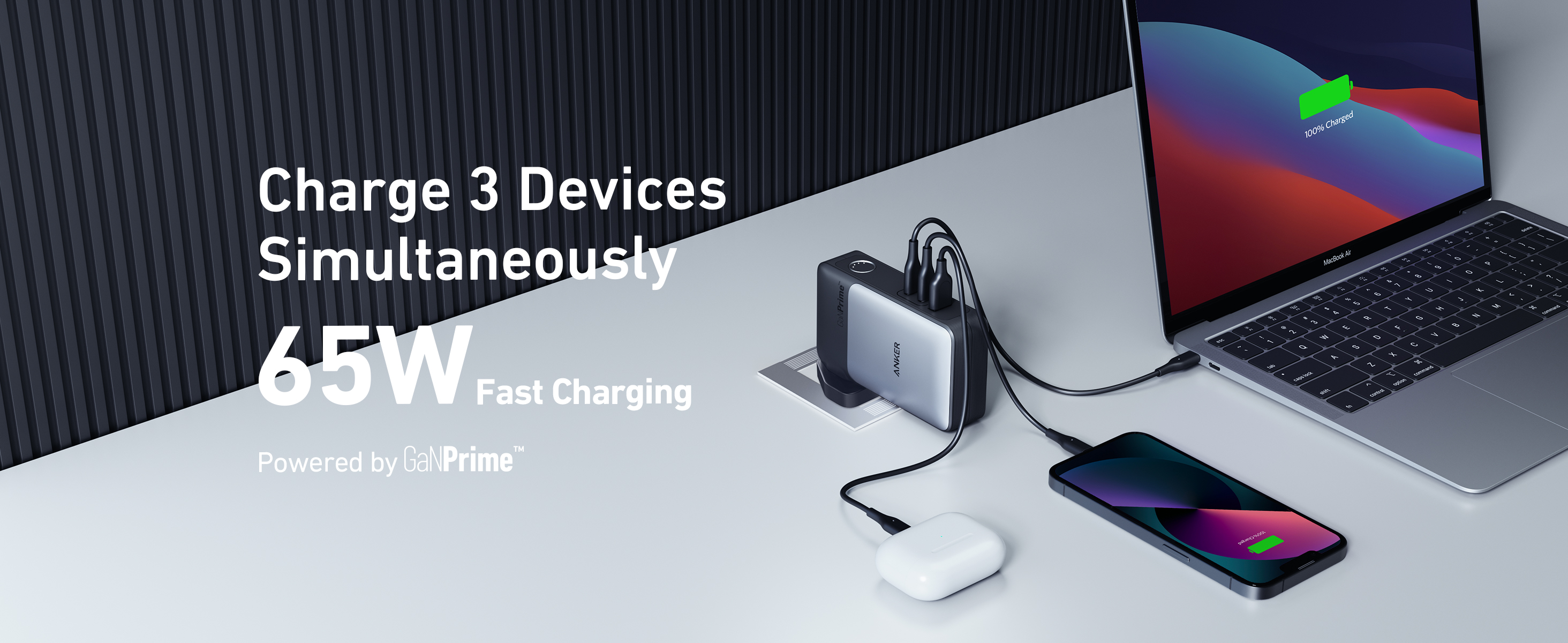 Nhờ trang bị 2 cổng USB-C và 1 cổng USB-A, giúp bạn có thể dễ dàng sạc cùng lúc 3 thiết bị công suất lớn lên đến 65W