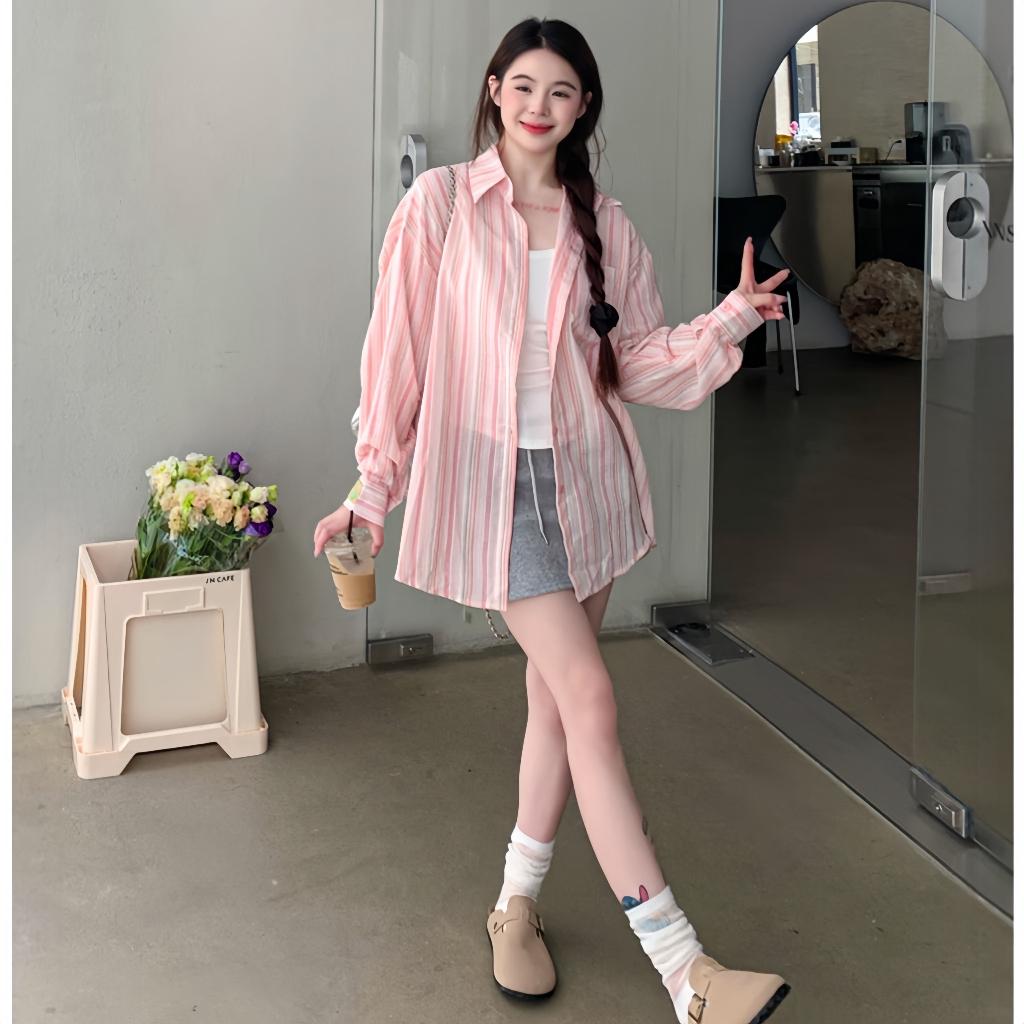Áo kiểu nữ sơ mi dài tay kẻ sọc chất đũi 2 màu xinh pastel Qiho bảo hành đổi trả :