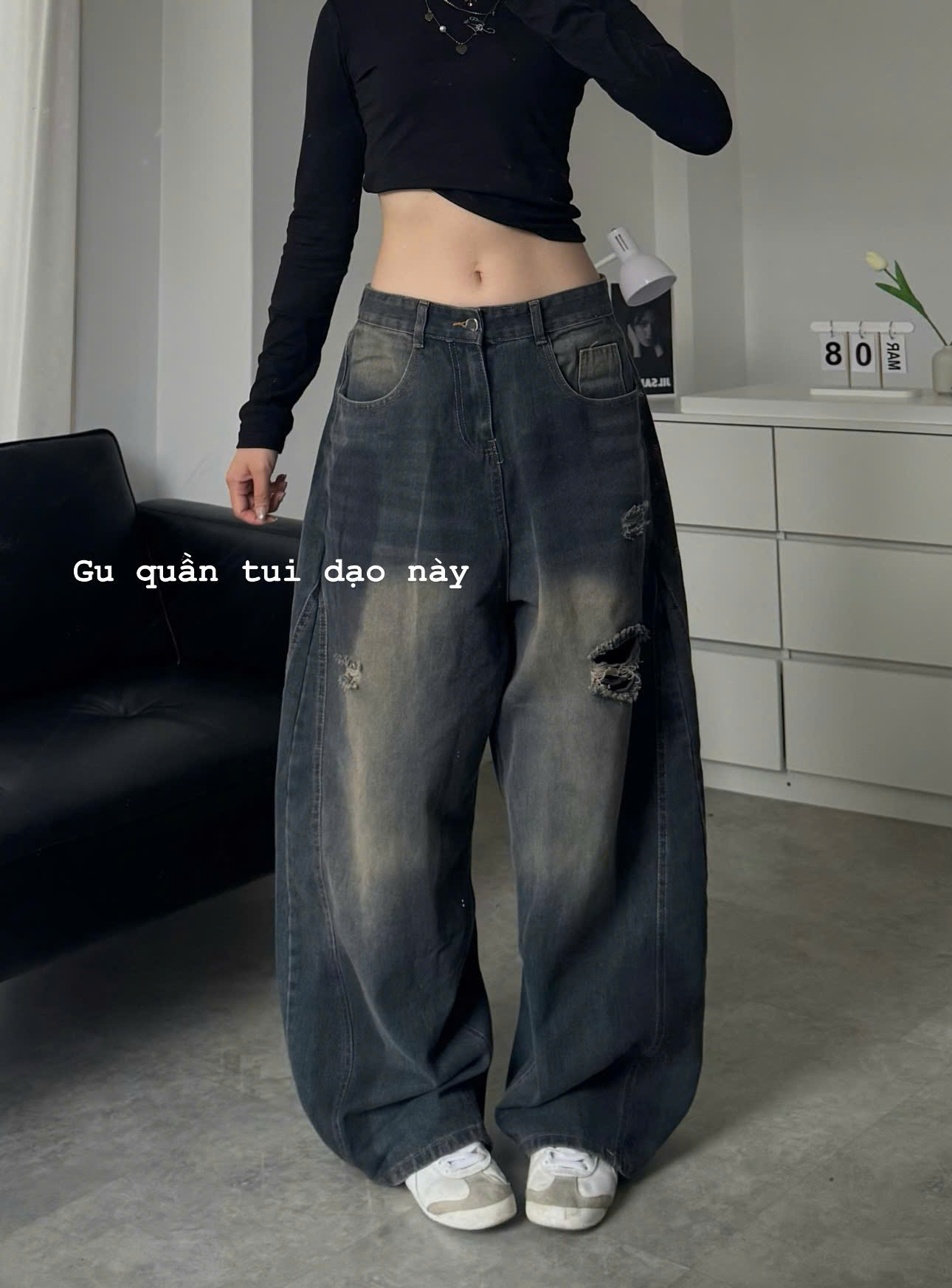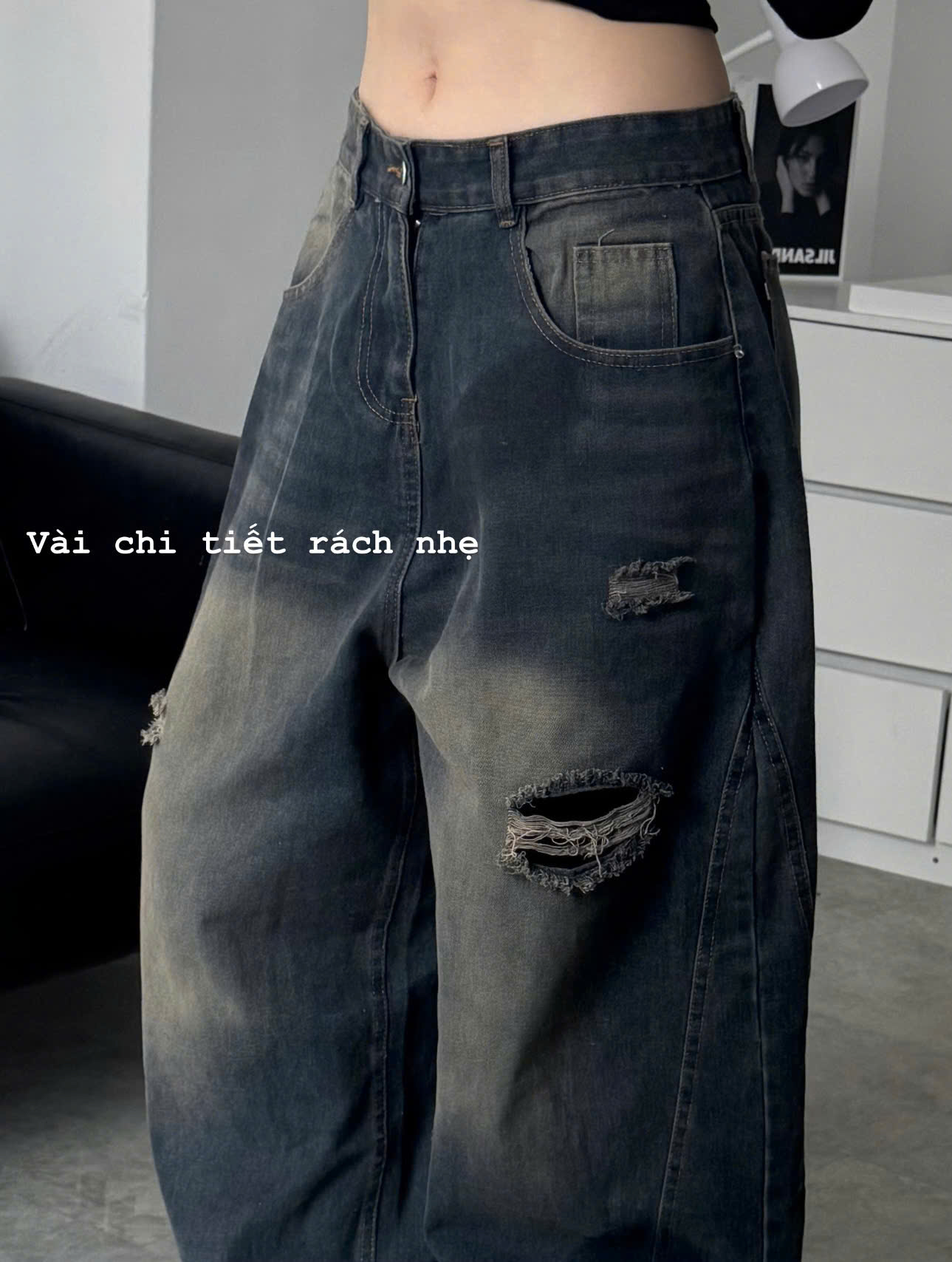 chuyển, tạo cảm giác thoải mái. Các chi tiết rách nhẹ tạo điểm nhấn, thêm phần bụi bặm và cá tính.