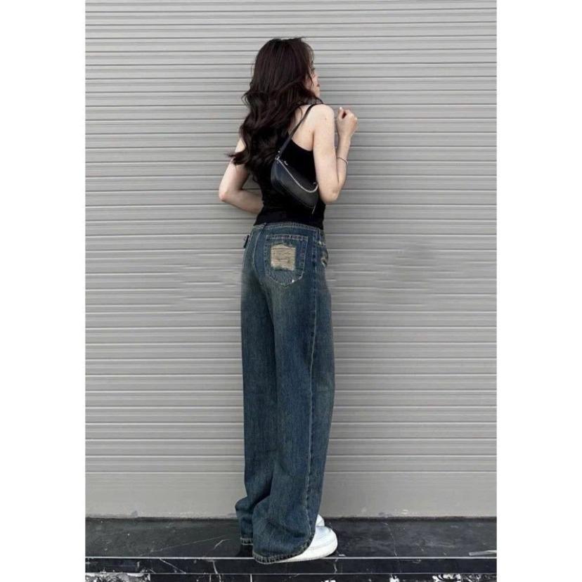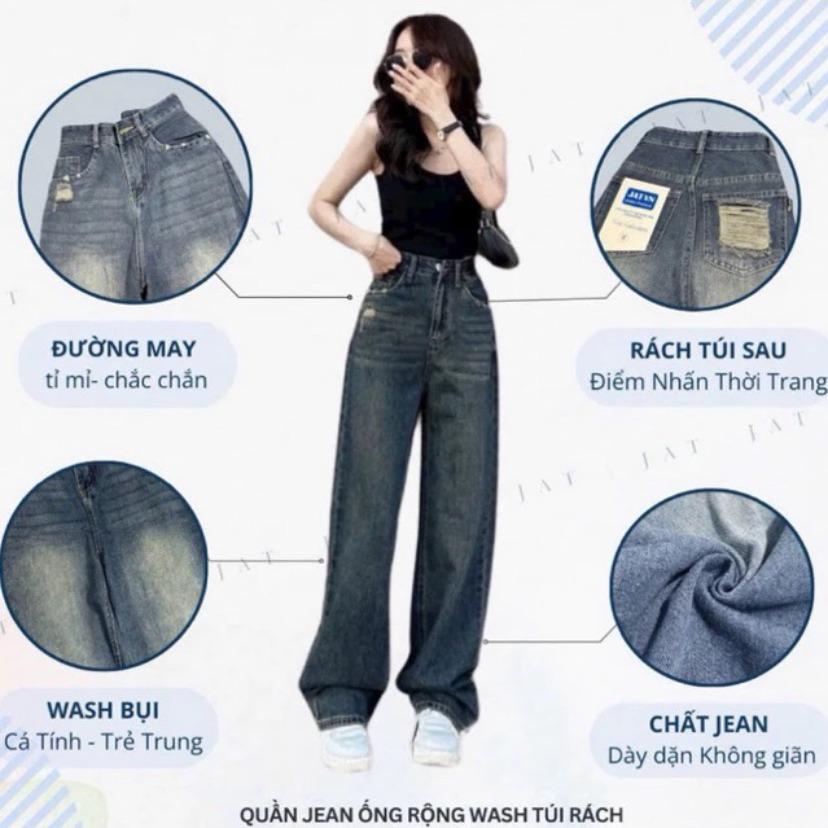 Quần jeans xuông nữ ống rộng rách túi sau hai màu đậm nhạt thích hợp với nấm lùn Pants