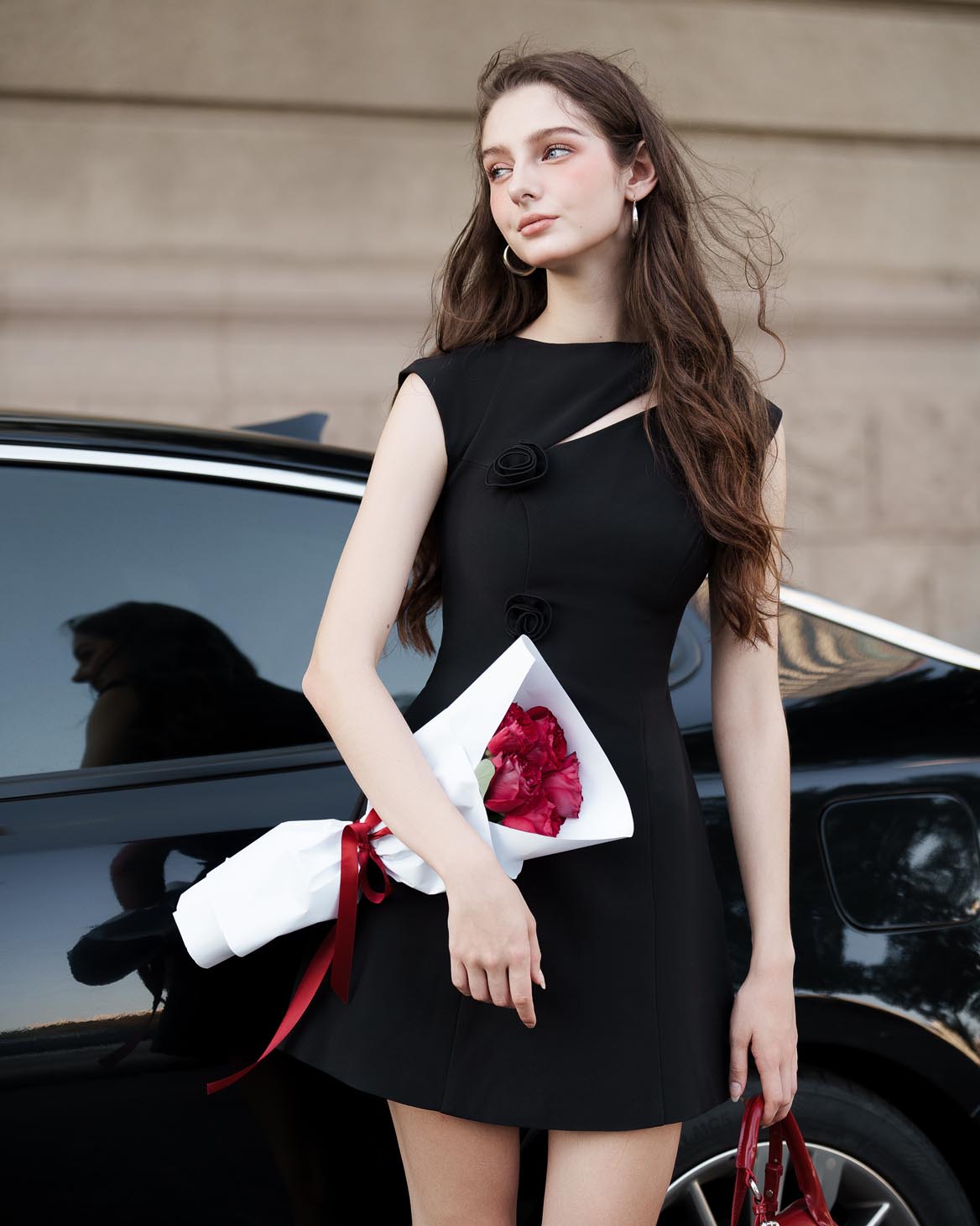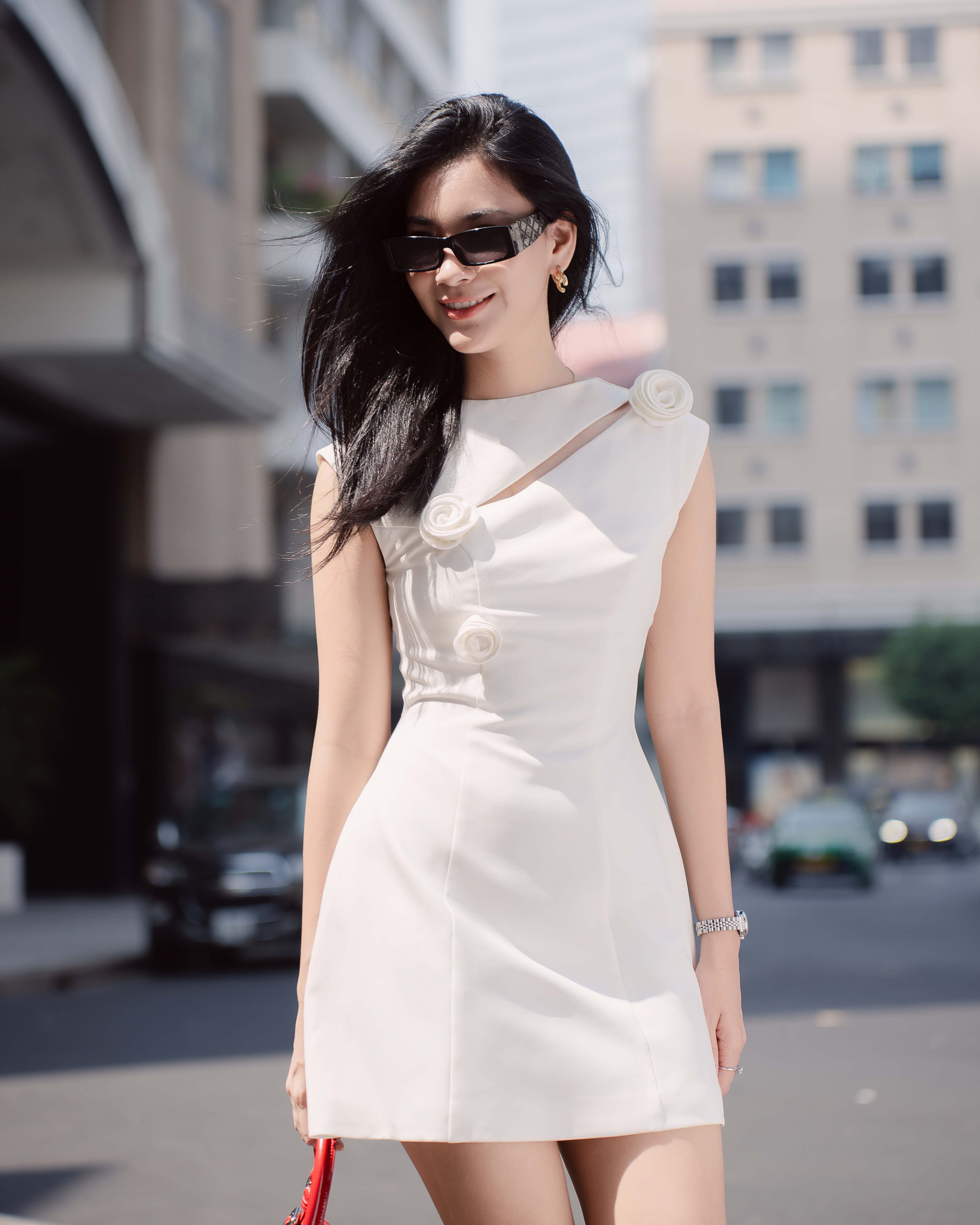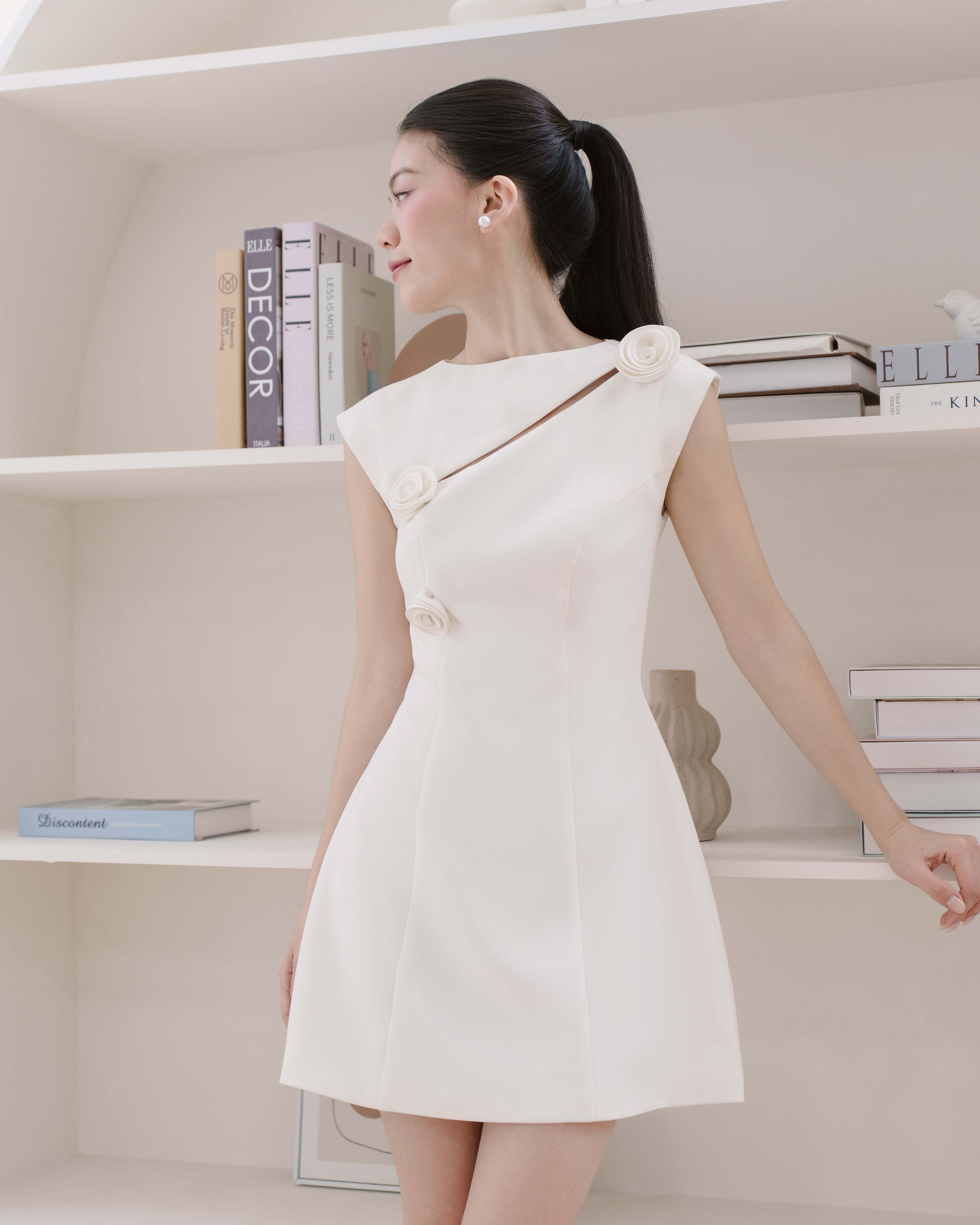- Đặc điểm: Đầm ngắn tay, cách điệu phần ngực, đính kèm hoa tăng điểm nhấn