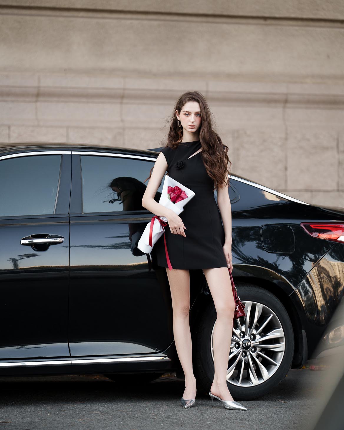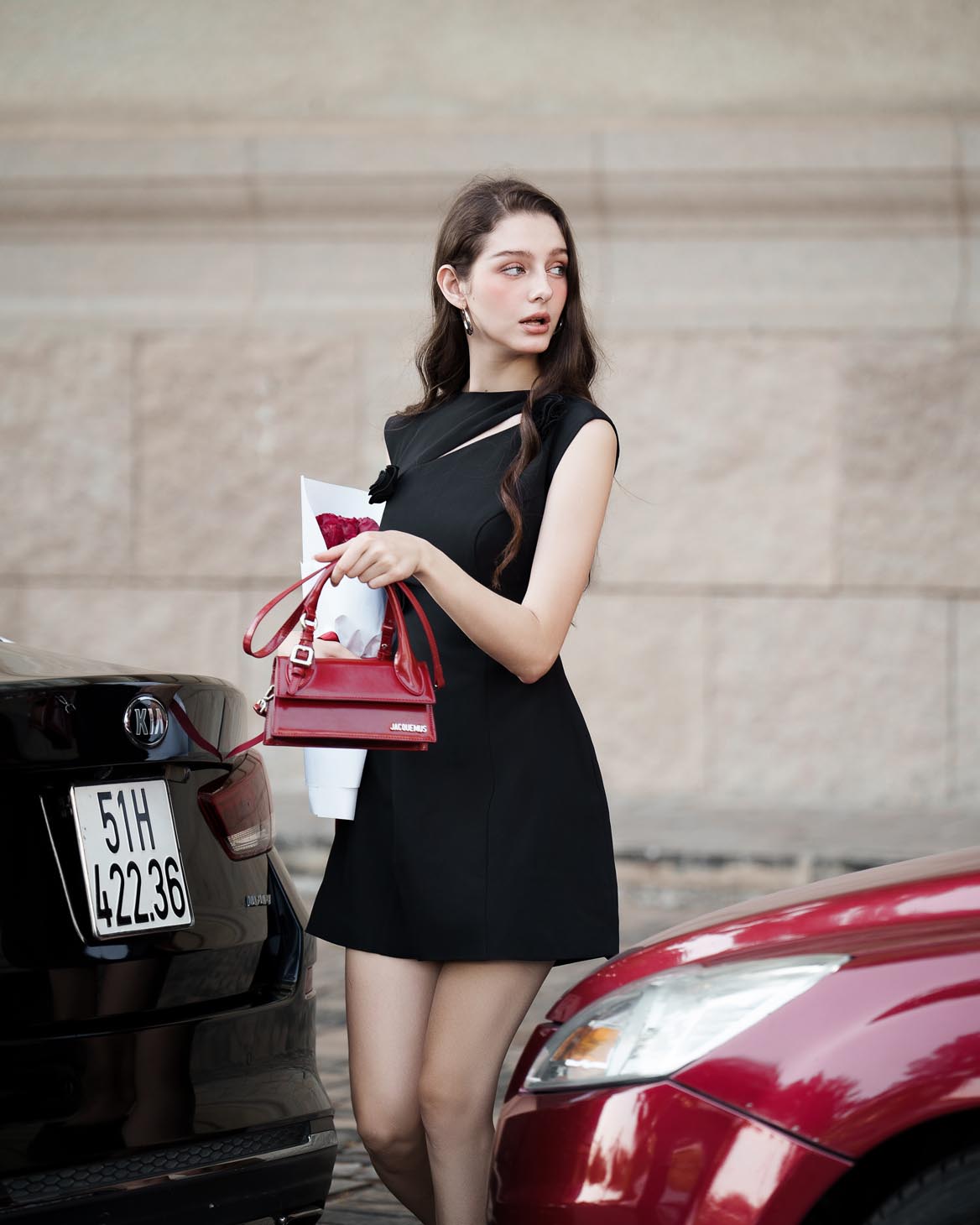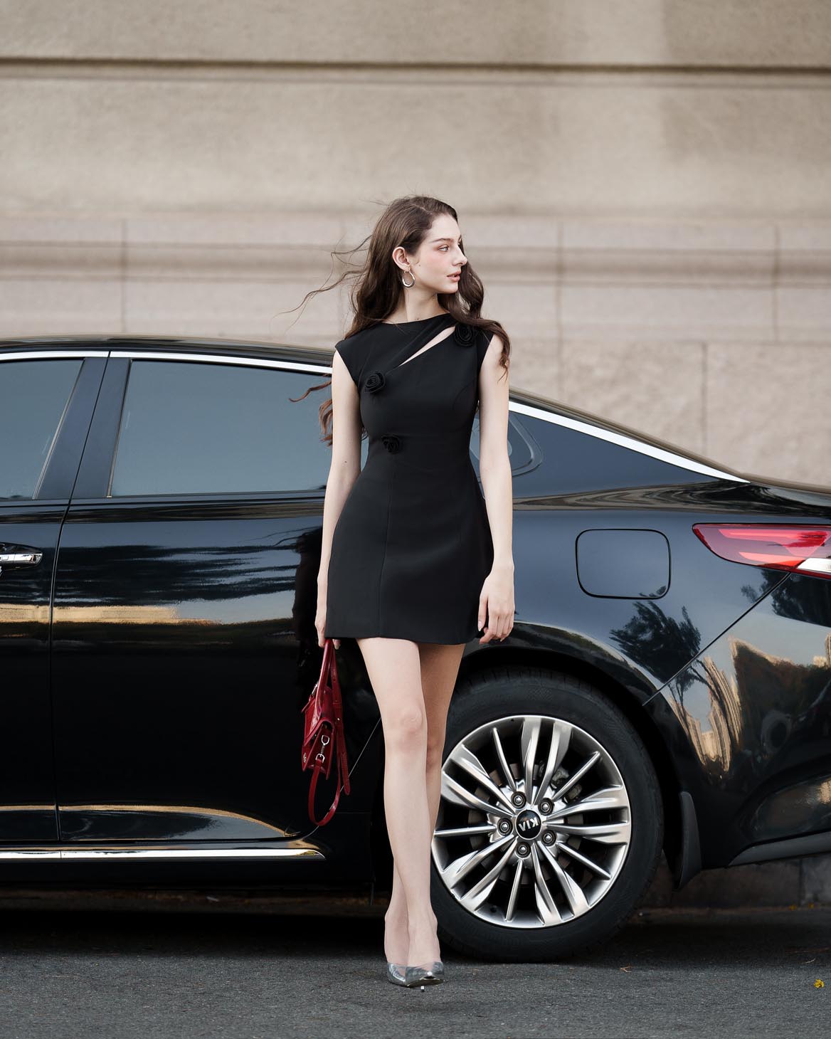 - Đặc điểm: Đầm ngắn tay, cách điệu phần ngực, đính kèm hoa tăng điểm nhấn