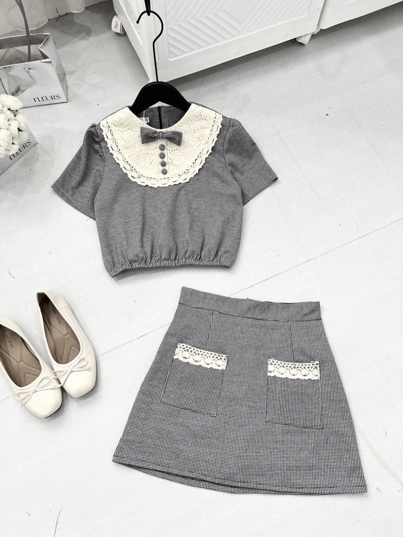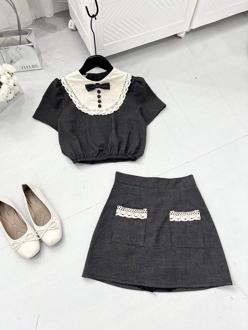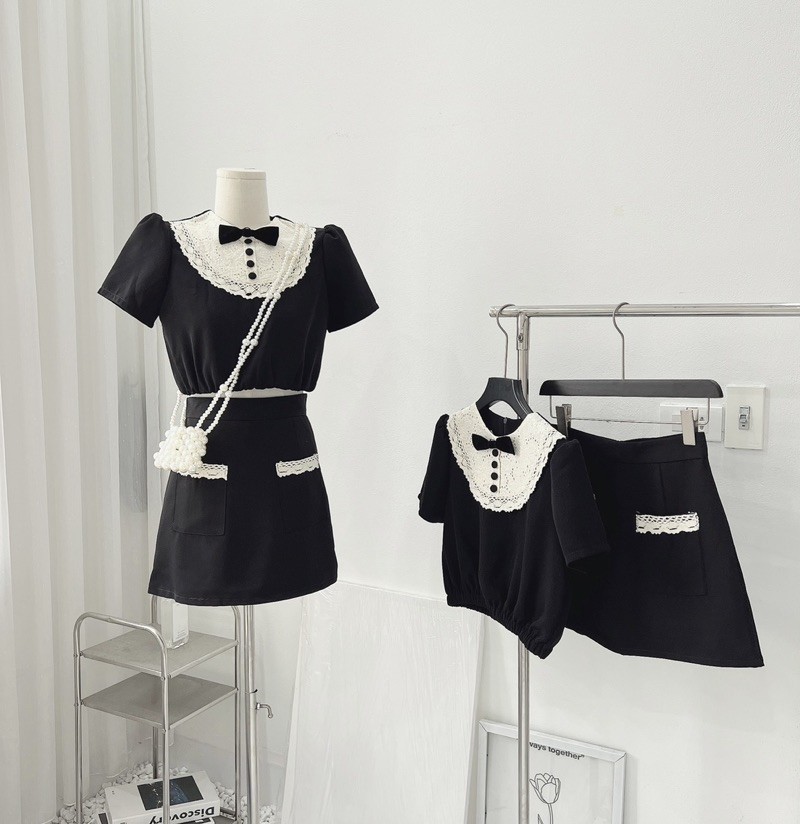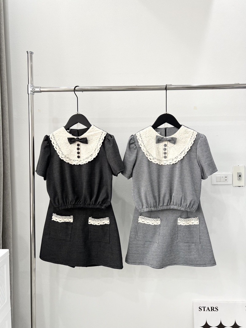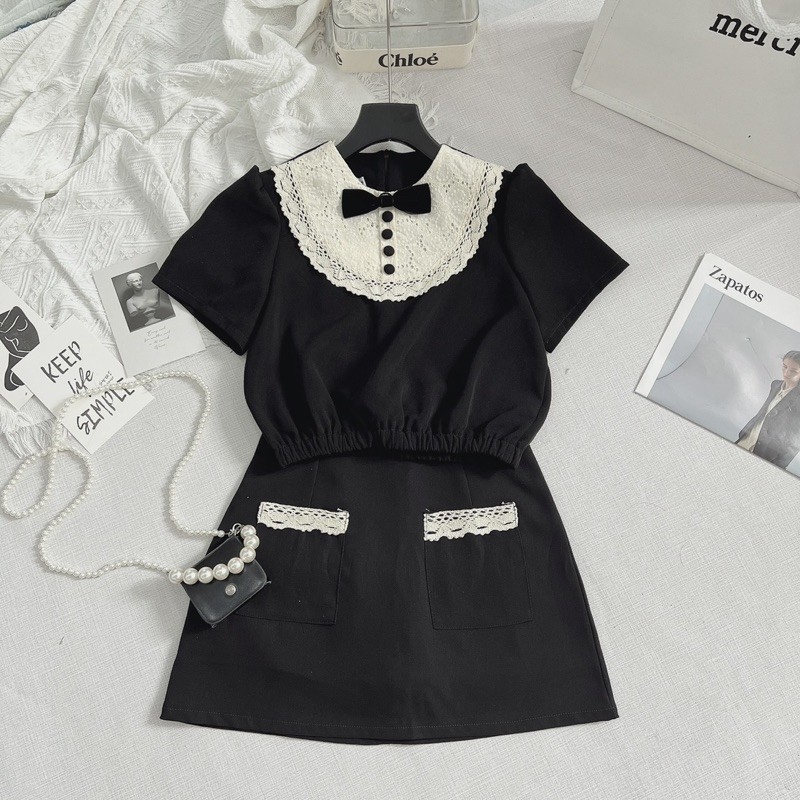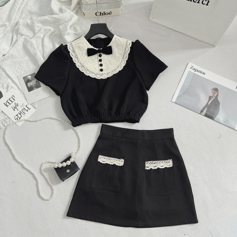 [S2.202] Set Tuyết Mưa Áo Cổ Phối Ren Nơ Khuy Bọc Mix Chân Váy Chữ A Siêu Xinh, Bộ Nữ Tiểu Thư Pha Ren Có Ảnh Thật