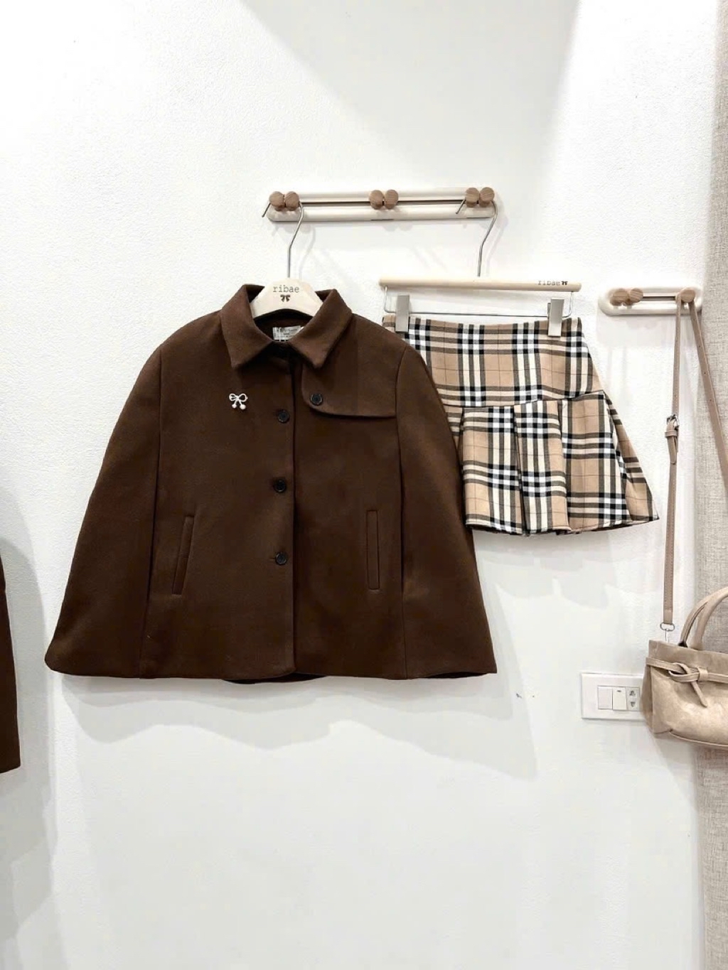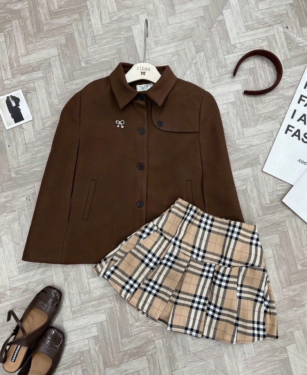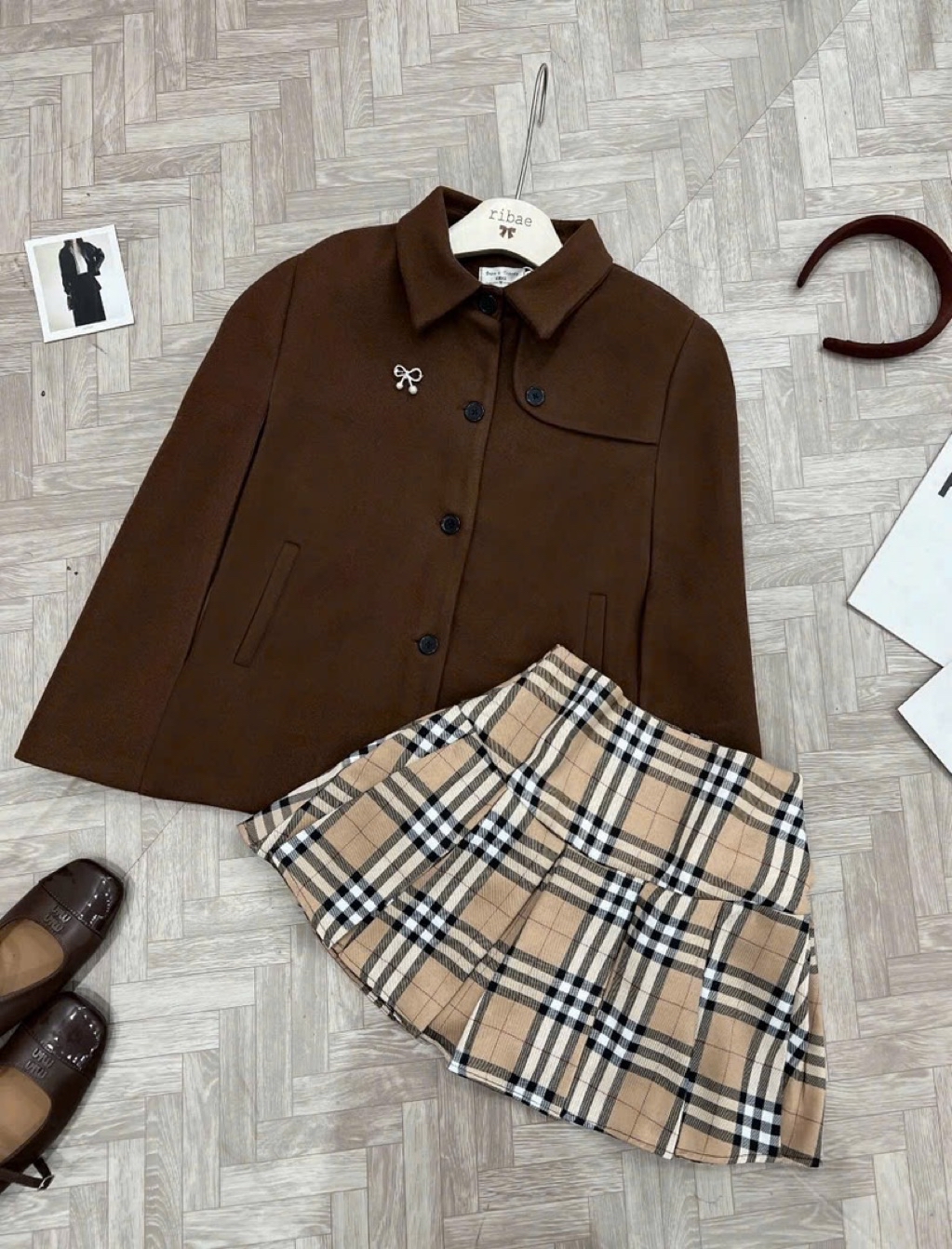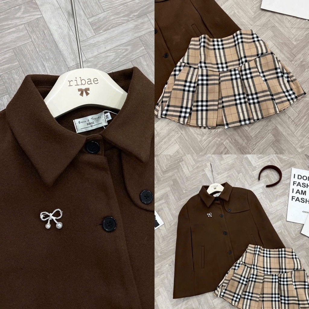 [S2.4276] Set Áo Dạ Choàng Nâu Kèm Tang Nơ Mix Chân Váy Kẻ