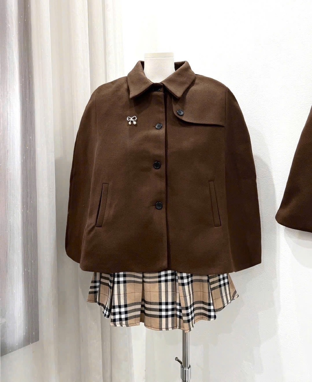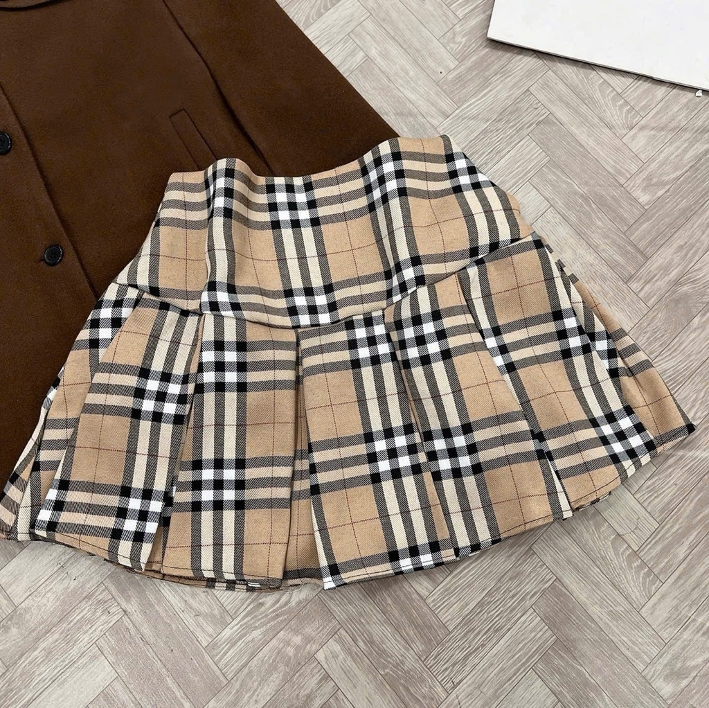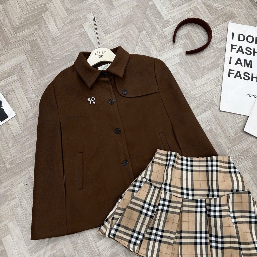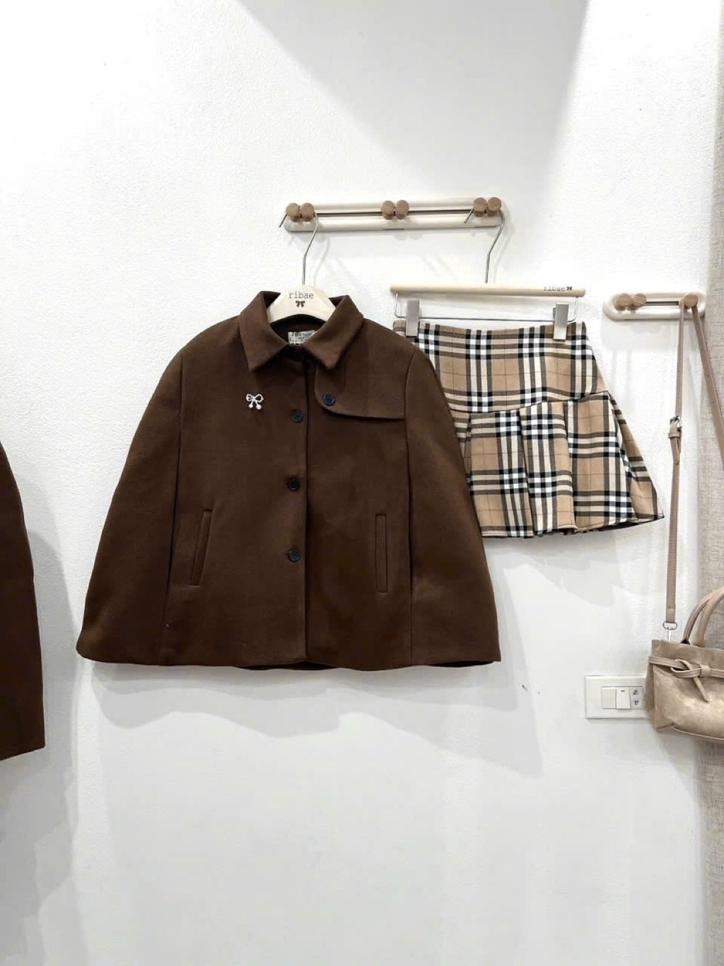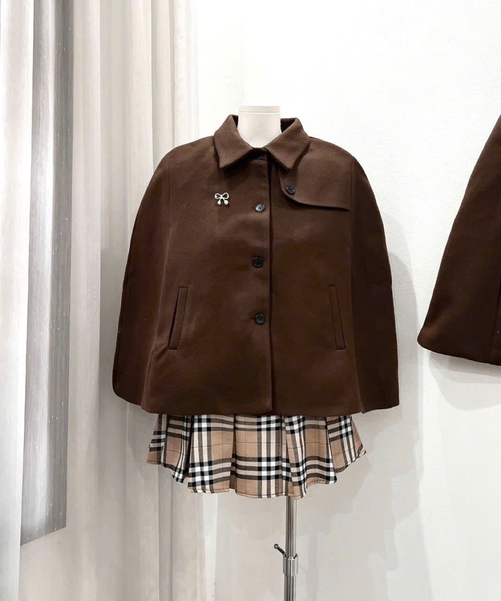 [S2.4276] Set Áo Dạ Choàng Nâu Kèm Tang Nơ Mix Chân Váy Kẻ