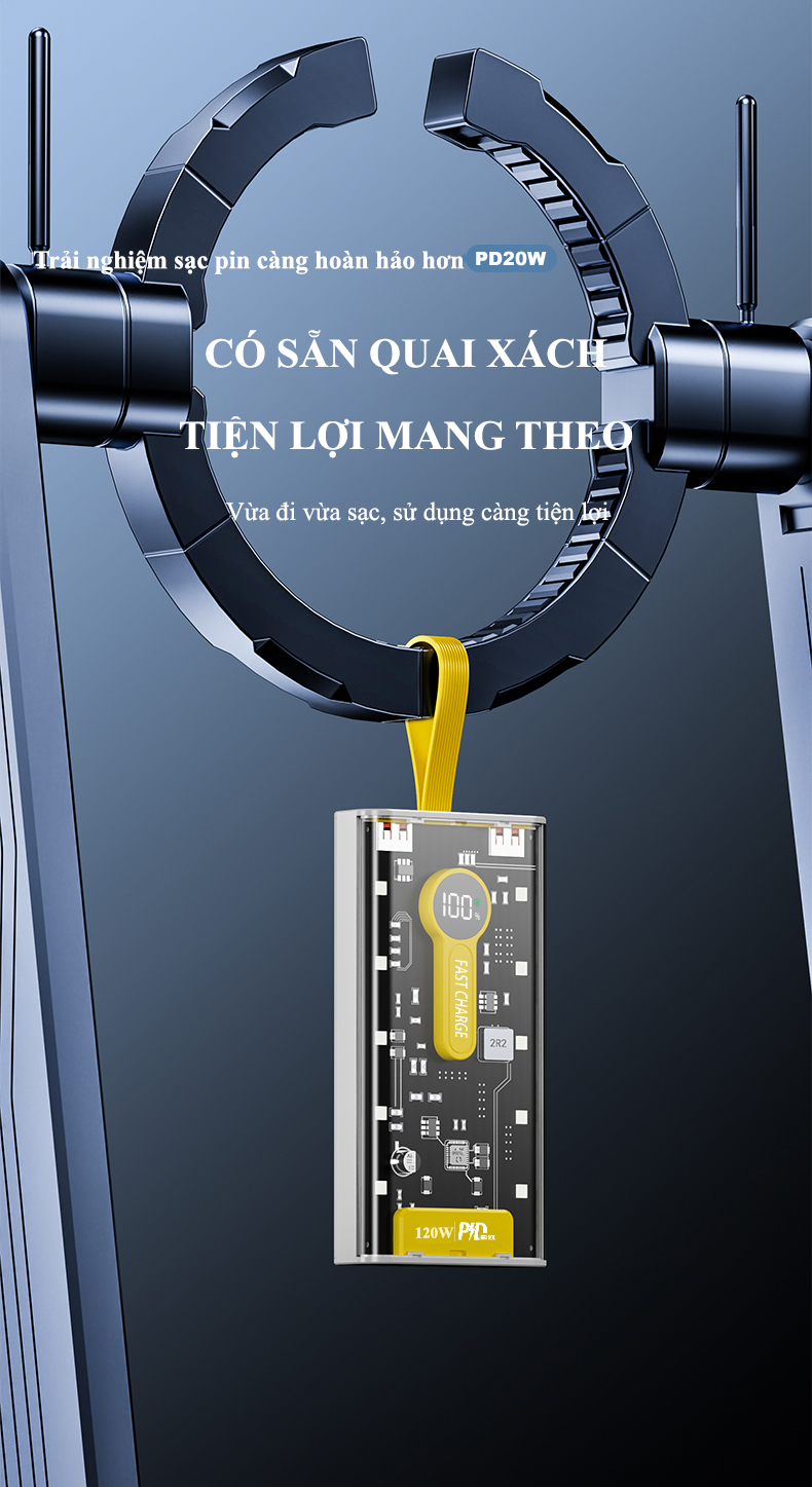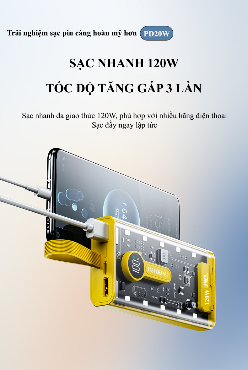 Sạc Dự Phòng Trong Suốt 30000mAhVới 2 Cổng Sạc Nhanh 20W và PD 120W Kèm 4 Đầu Sạc Màn Hình LED