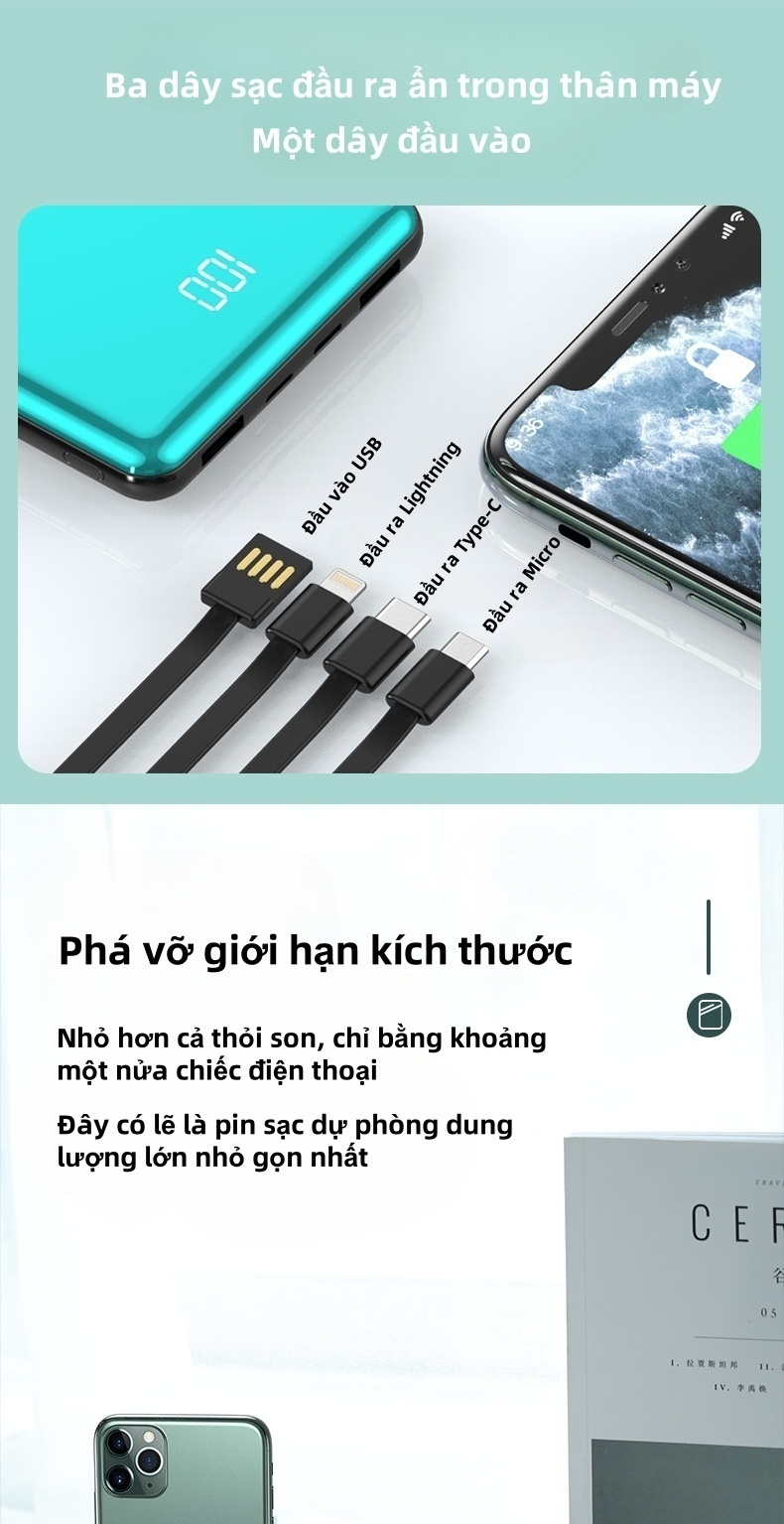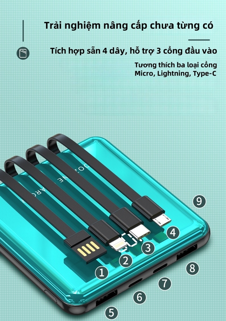 Được trang bị sẵn 4 dây sạc với chuẩn nhanh, tương thích đa dạng các thiết bị phổ biến như iPhone, Android, Type-C, Micro USB, không cần mang thêm cáp rườm rà.