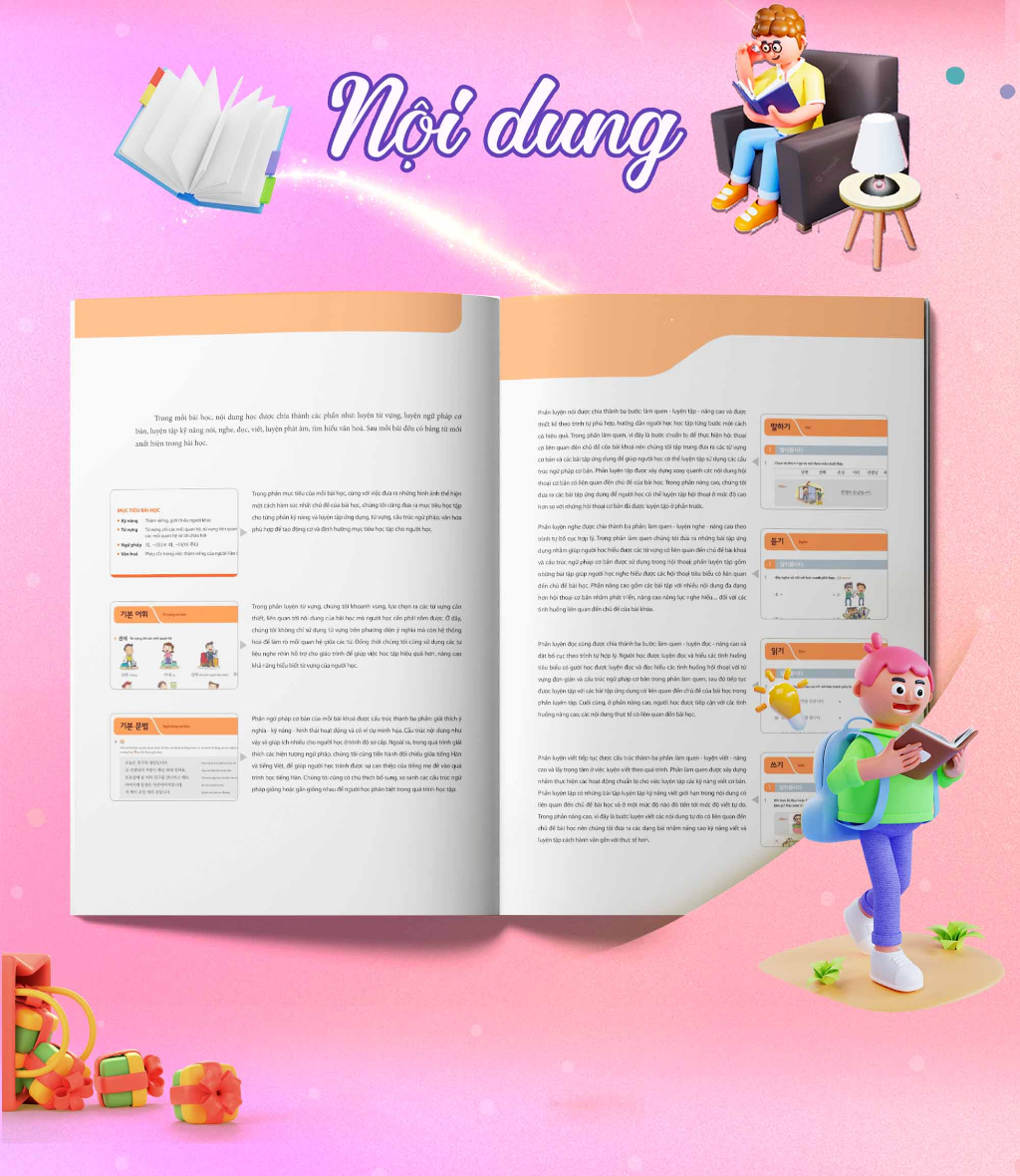 Cuốn sách này dành cho người học sau khi vượt qua tiếng Hàn trình độ sơ cấp rồi thì bắt đầu luyện tập sang đến trình độ trung cấp và cao cấp. Cuốn sách có 2 phiên bản 1 bản màu và 1 bản đen trắng tùy thuộc nhu cầu của người học với các nội dung cơ bản bao gồm: