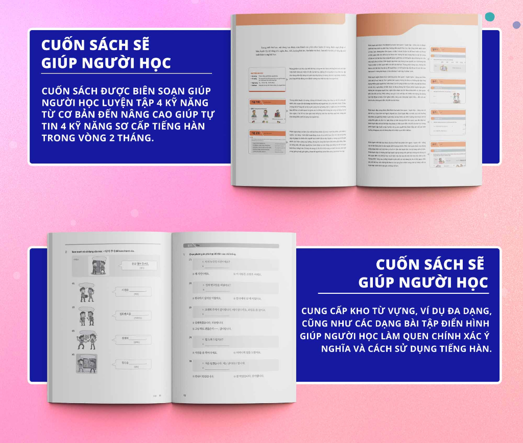 - Cuốn sách được biên soạn giúp người học luyện tập 4 kỹ năng từ cơ bản đến nâng cao giúp tự tin 4 kỹ năng sơ cấp tiếng Hàn trong vòng 2 tháng.