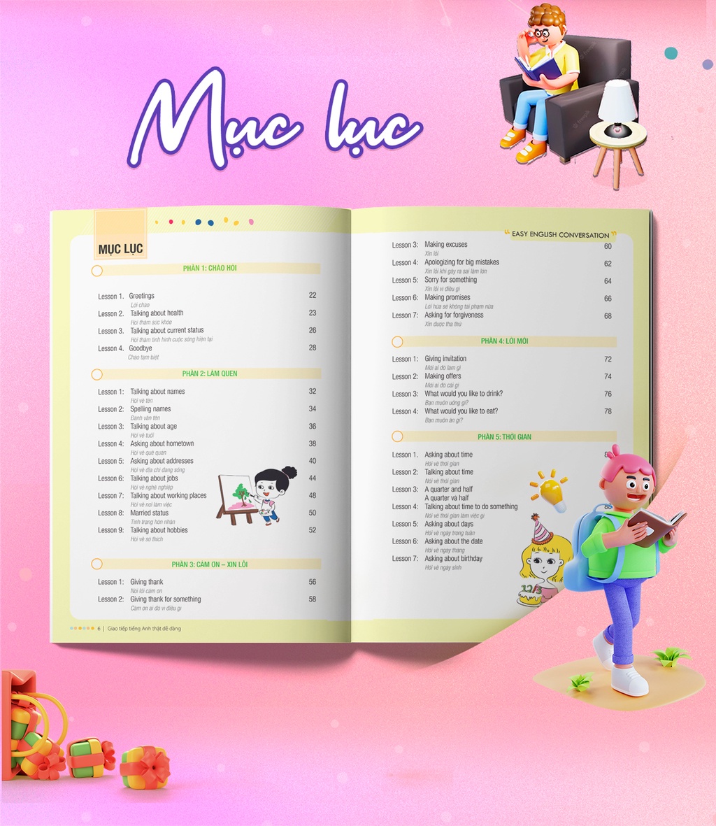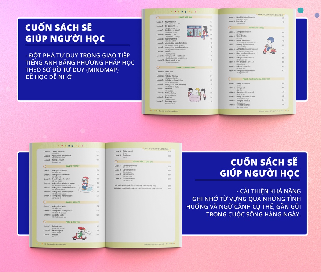 - Những phần tiếp theo của cuốn sách đi sâu vào hướng dẫn kiến thức tiếng Anh giao tiếp qua từng chủ đề thông dụng nhất trong cuộc sống.