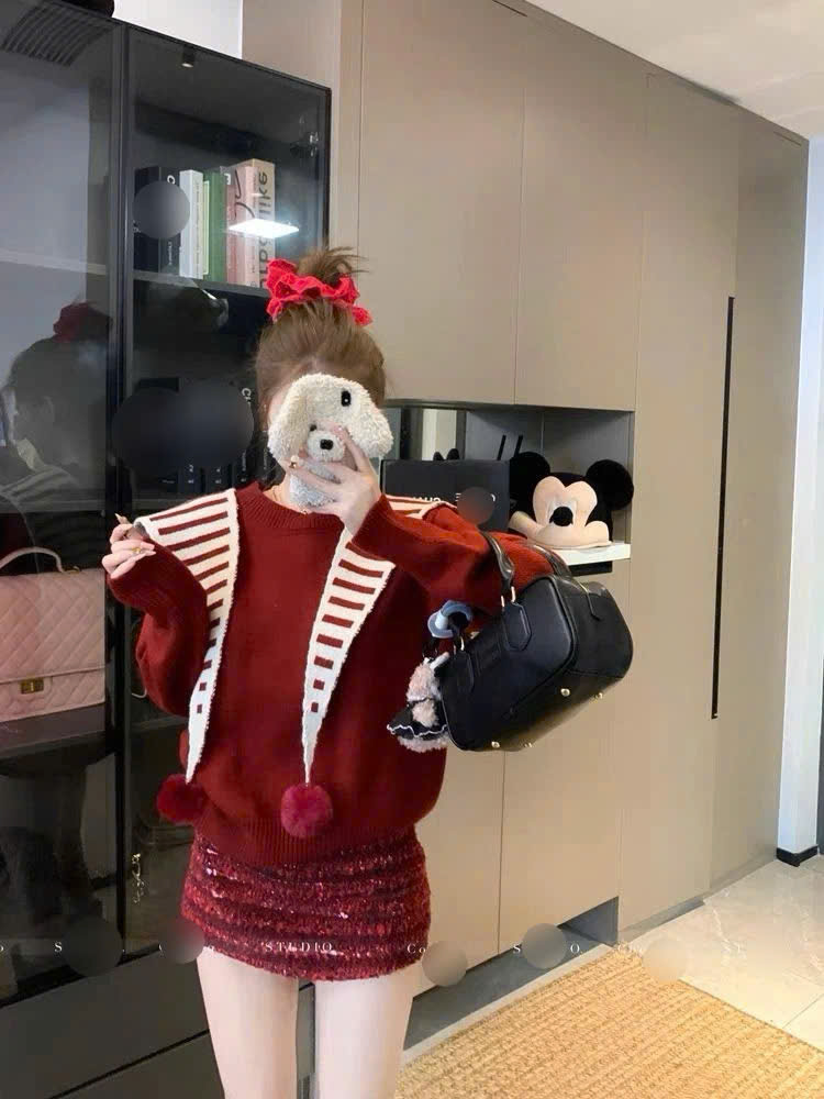 Set áo len trơn màu đỏ kèm khăn choàng kẻ mua thu đông, áo len nữ basic khăn kẻ thủy thủ quả bông