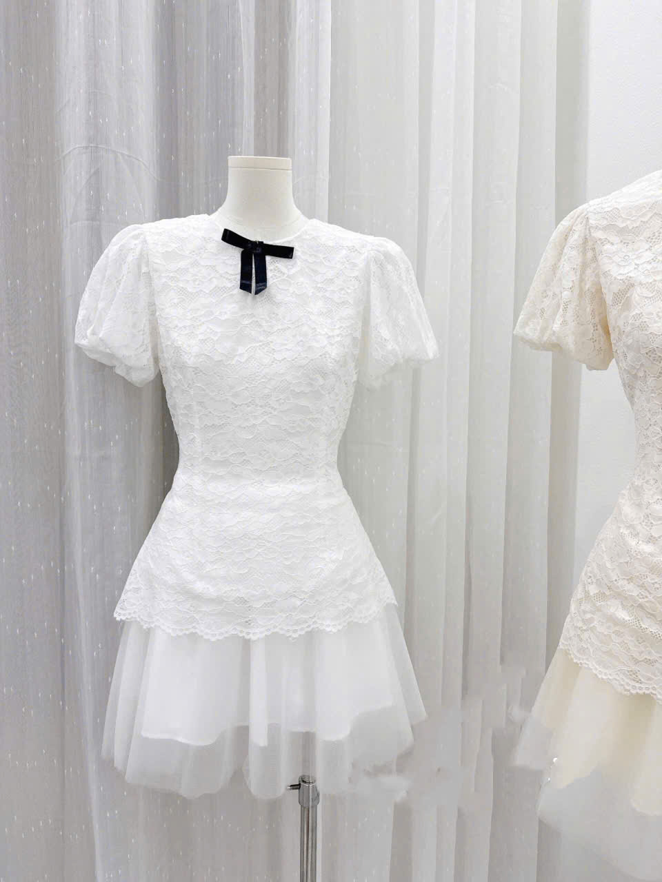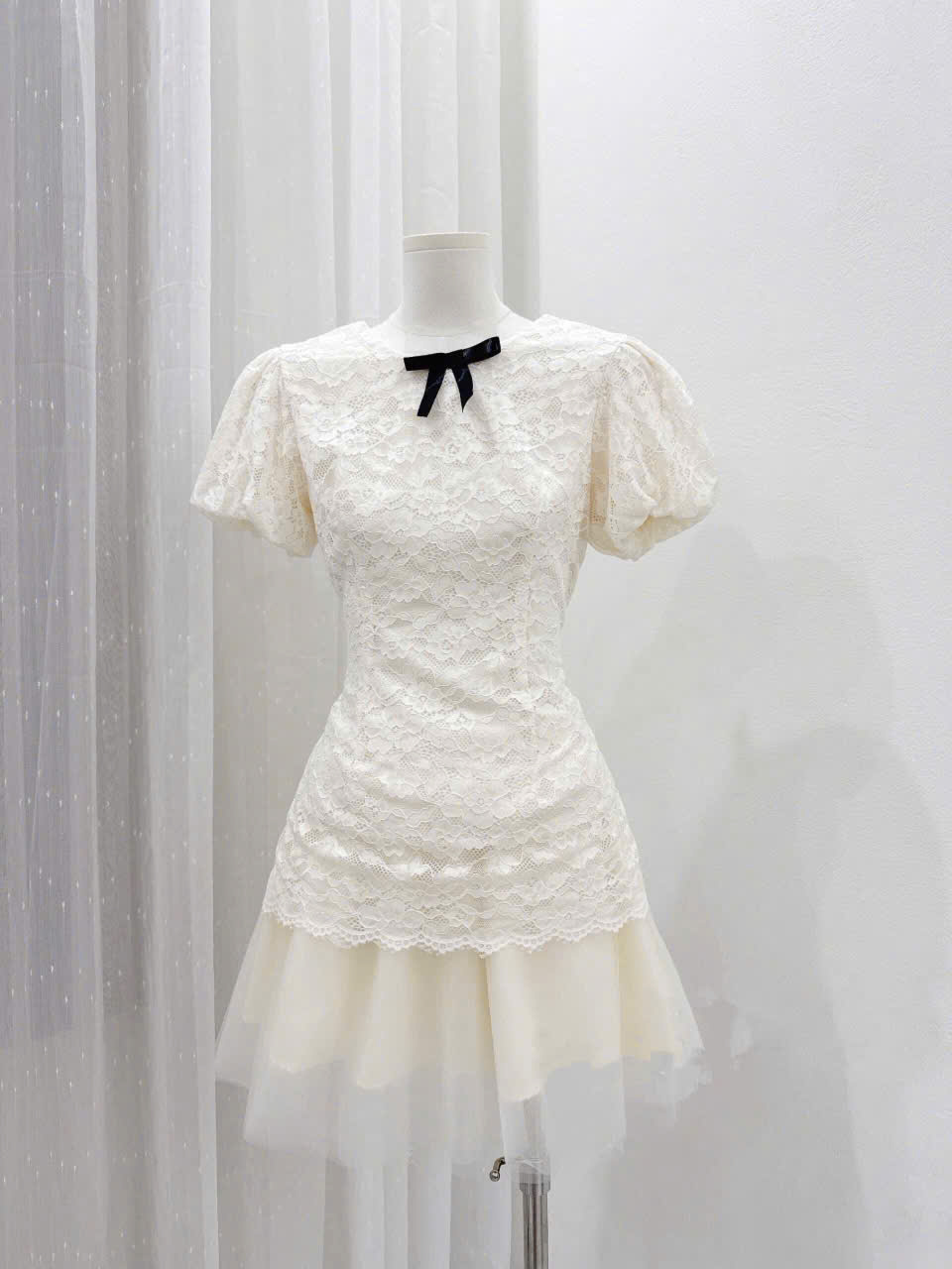 Set Áo Ren 2 Màu Đính Nơ Đen, Cổ Tròn Tay Bồng Mix Chân Váy Lưới Tơ 4 Lớp Dáng Ngắn Bồng Bềnh Style Nàng Thơ (Ảnh Thật)