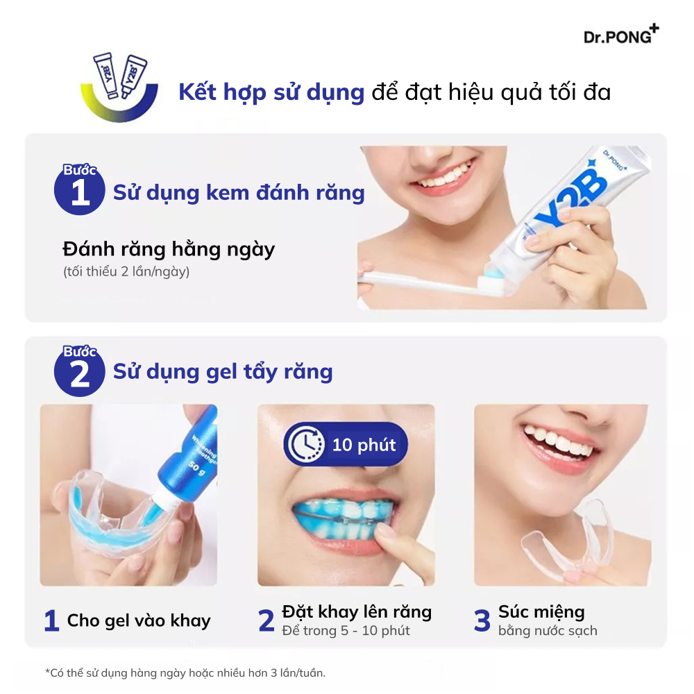 - Sử dụng kết hợp kem đánh răng trắng răng và Gel làm trắng răng Dr.PONG Y2B để đạt hiệu quả tốt.