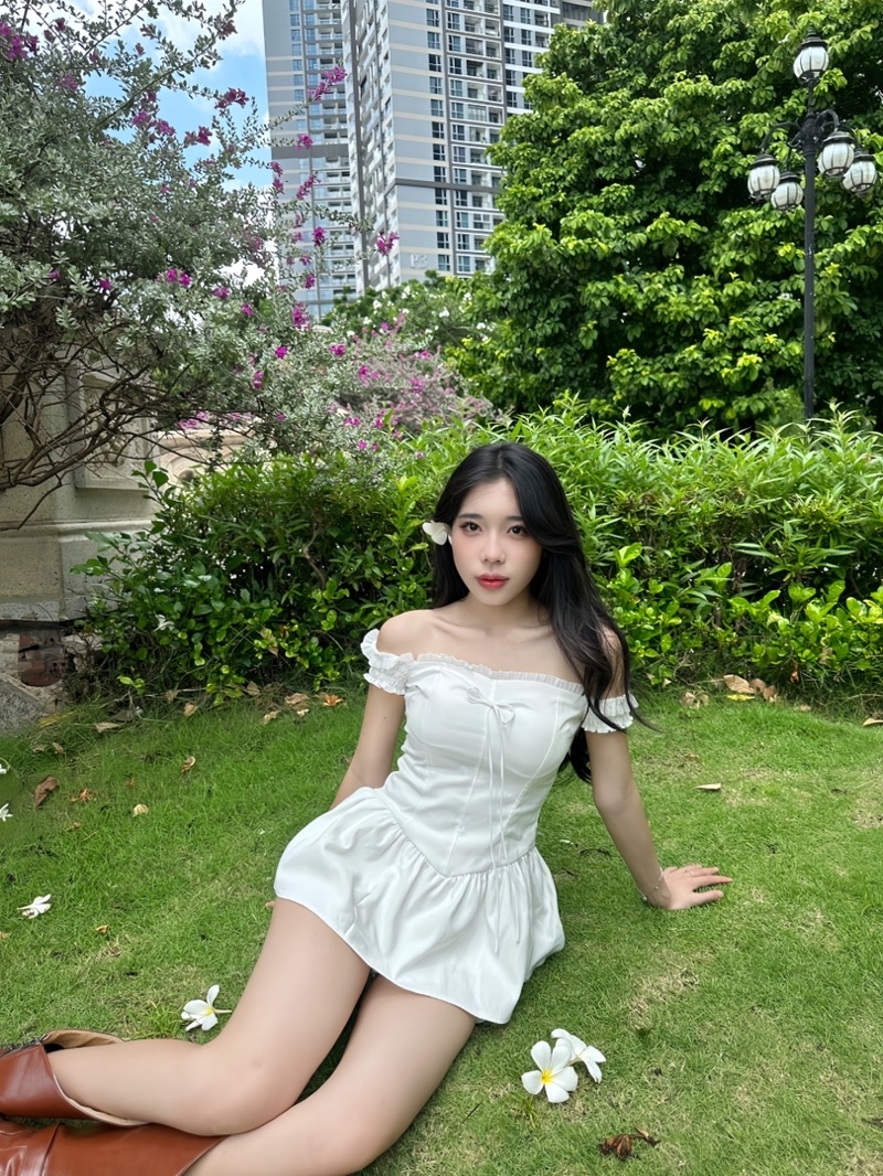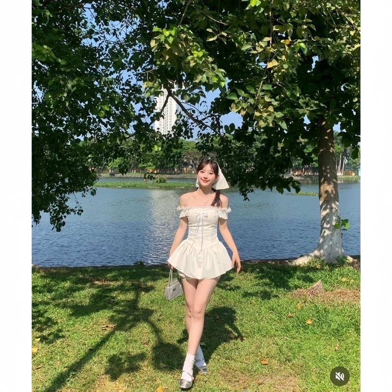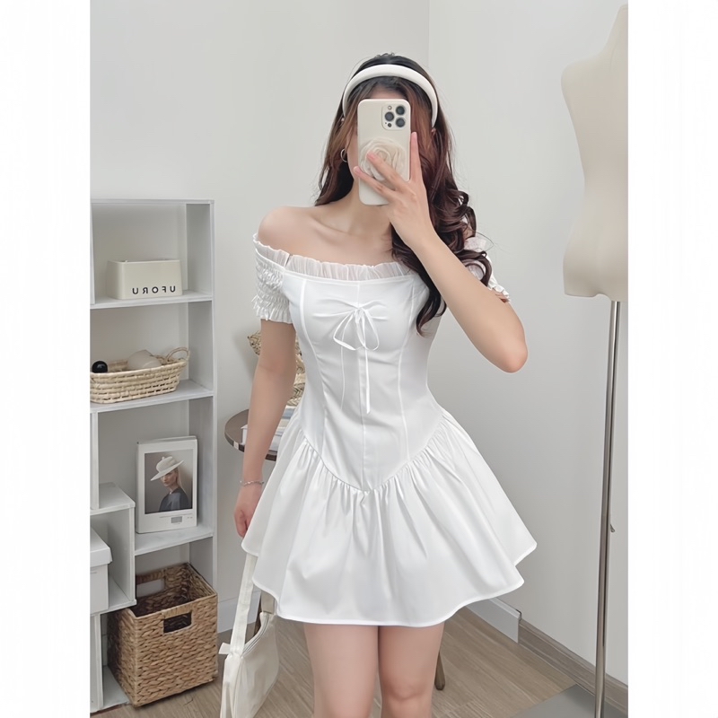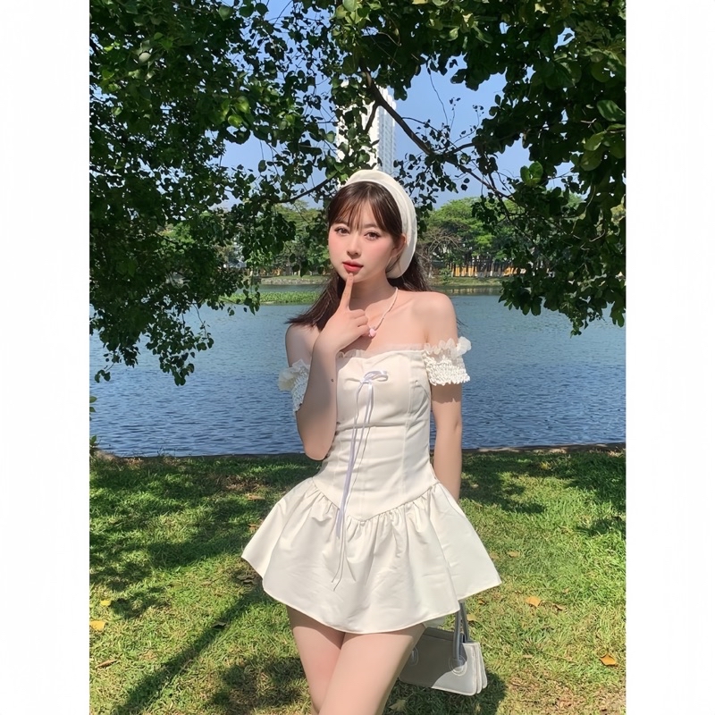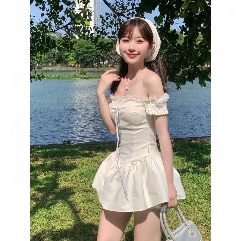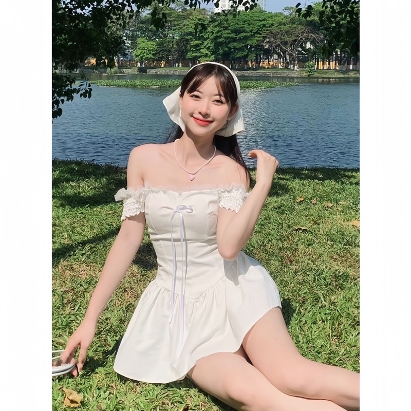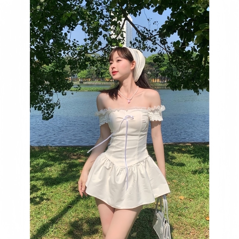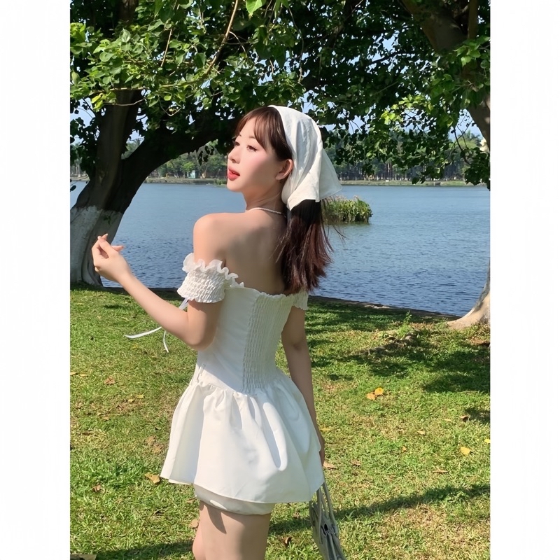 Sét Váy Dáng Ngắn Màu Trắng Gồm Váy Trễ Vai Gắn Nơ Chun Lưng + Quần Bảo Hộ + Khăn Turban