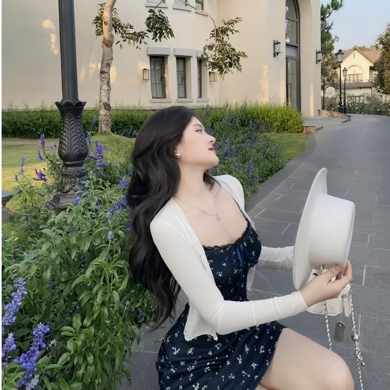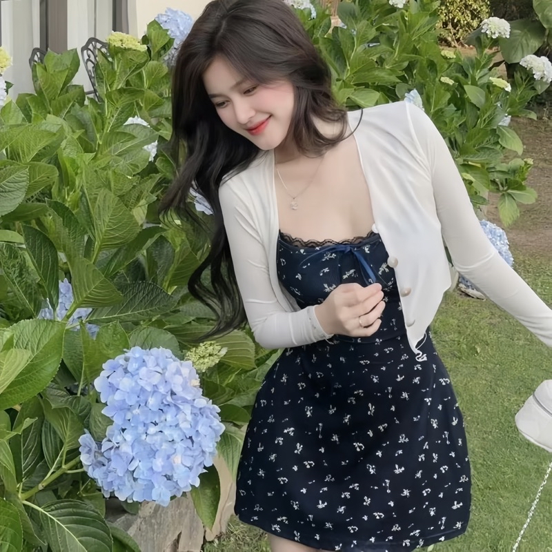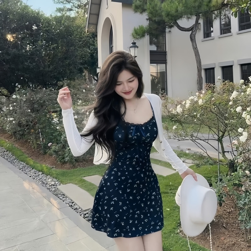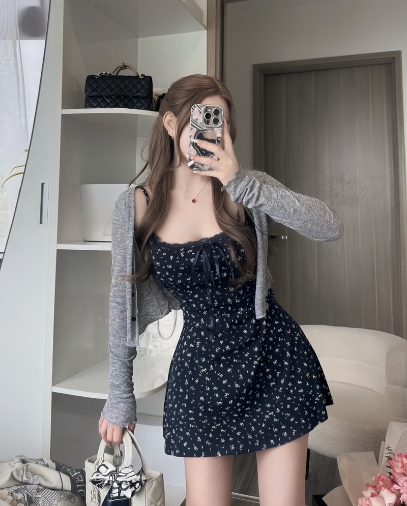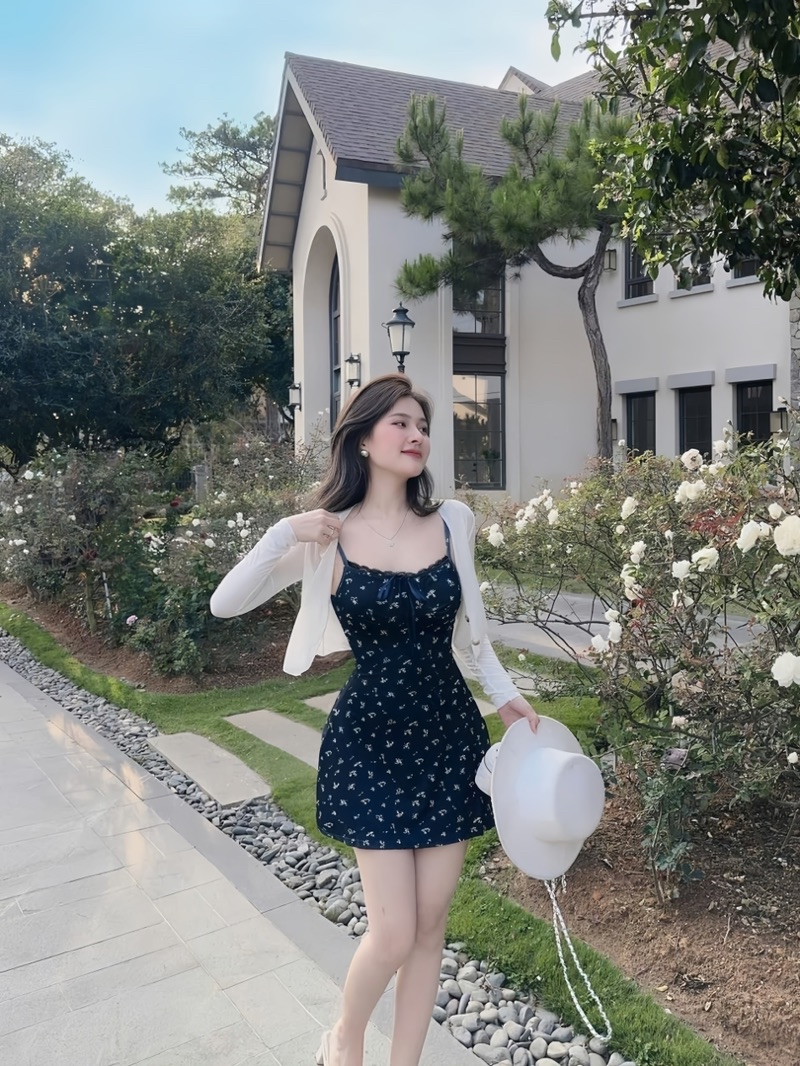 Sét Váy Hoa Nhí Màu Đen 2 Món Gồm Váy 2 Dây + Áo Khoác Ngoài