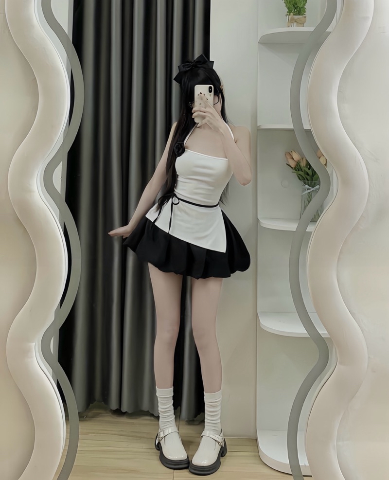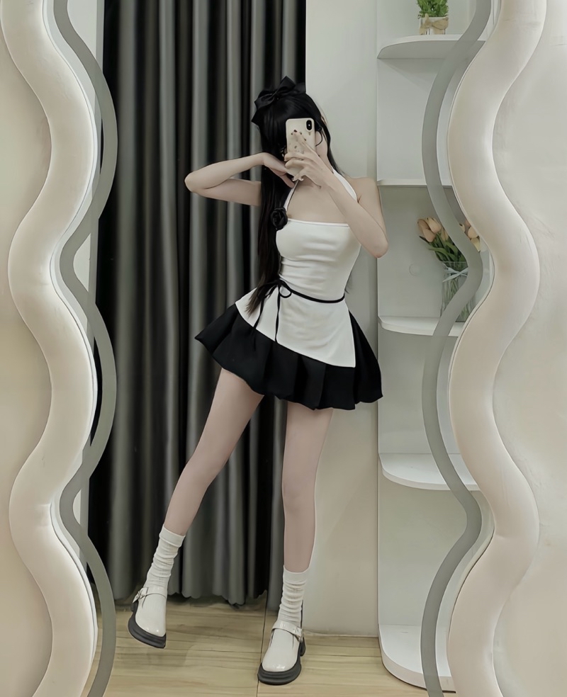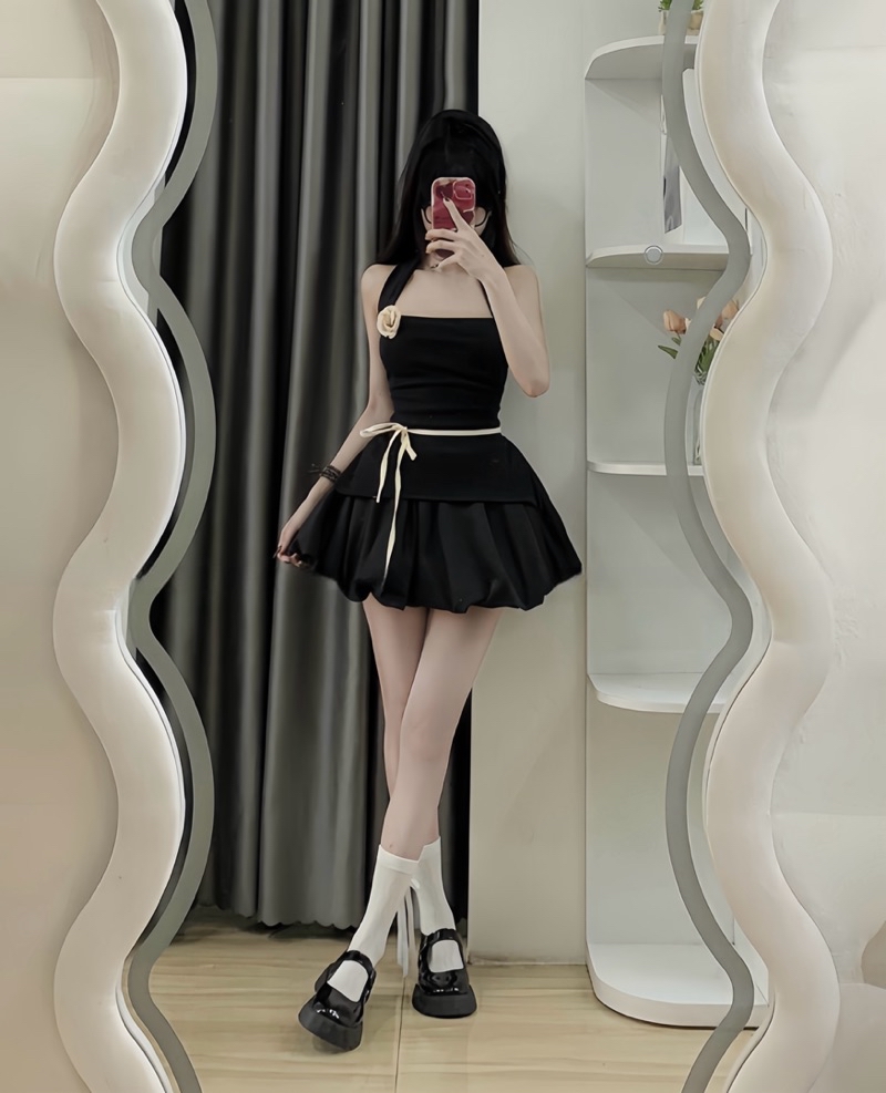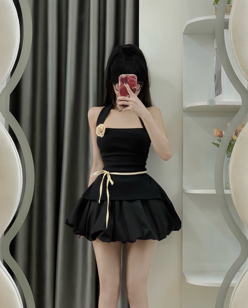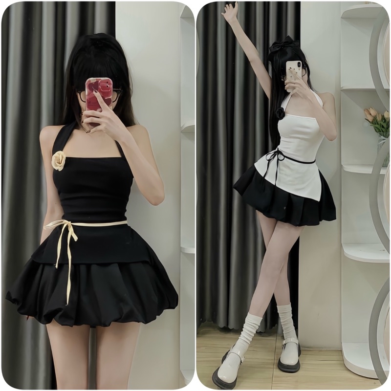 Sét Váy Nữ Kèm Hoa Gồm Áo Cổ Yếm Xẻ Dây Buộc Eo + Chân Váy Bí Phồng