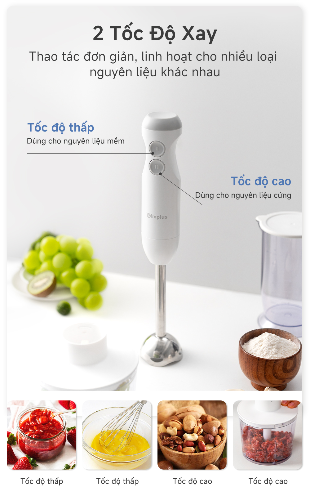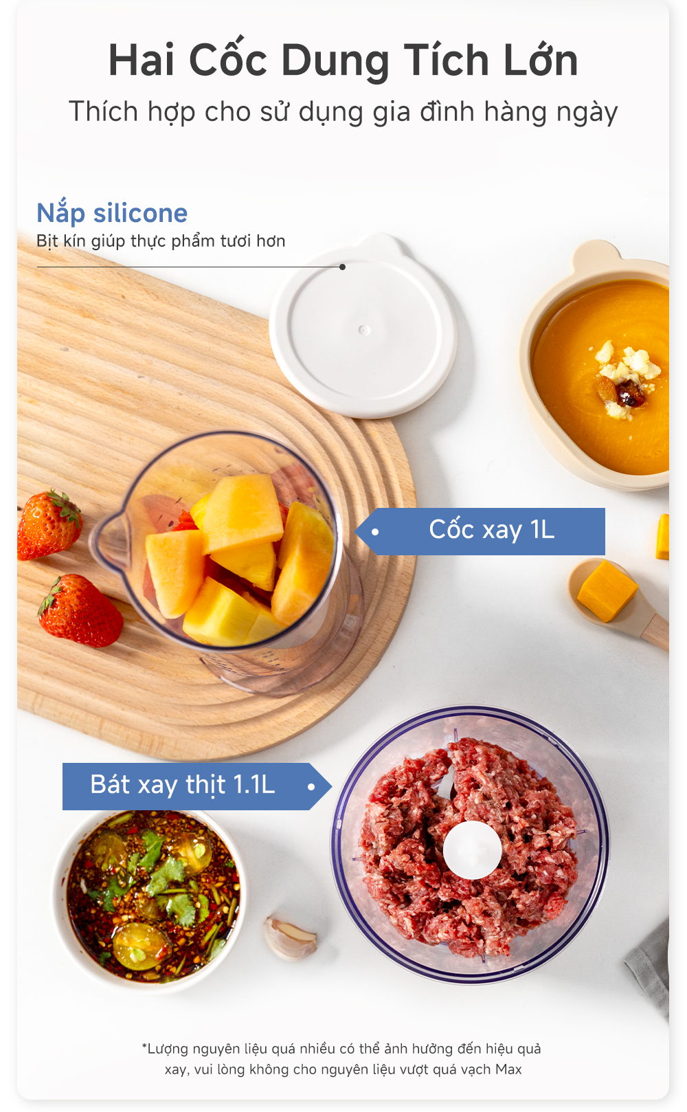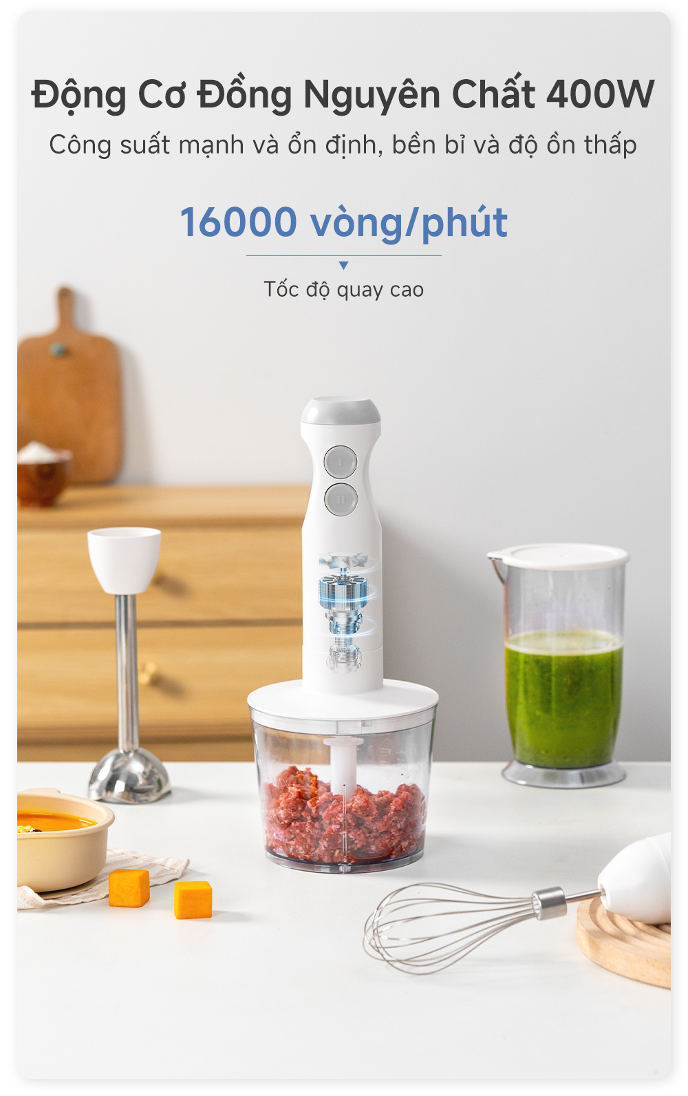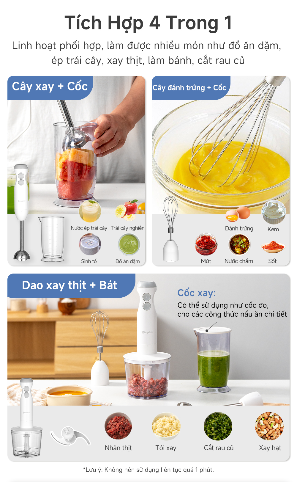 1. Máy Xay Đa Năng: Đi kèm 3 đầu phụ kiện, linh hoạt làm được nhiều món như xay thịt, đồ ăn dặm, xay rau củ, ép trái cây, đánh trứng và làm bánh