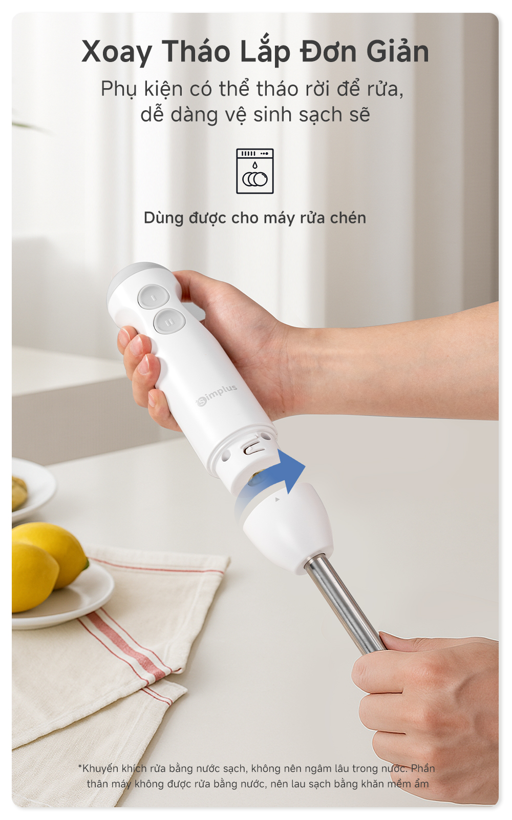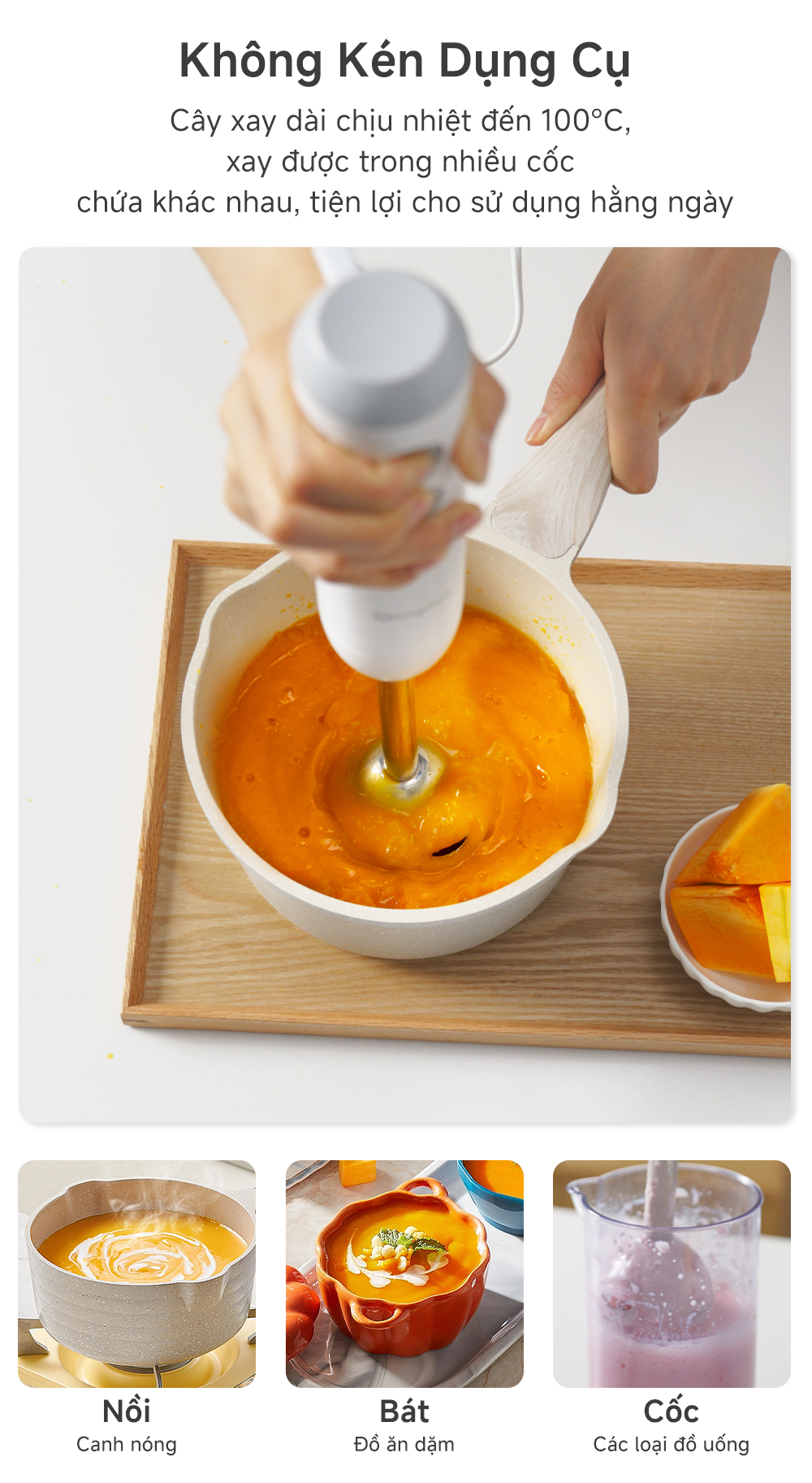 7. Thích Hợp Với Nhiều Loại Dụng Cụ: Cây xay chịu nhiệt lên đến 100°C, có thể xay trực tiếp trong nồi, bát hoặc cốc mà không cần phải rửa lại