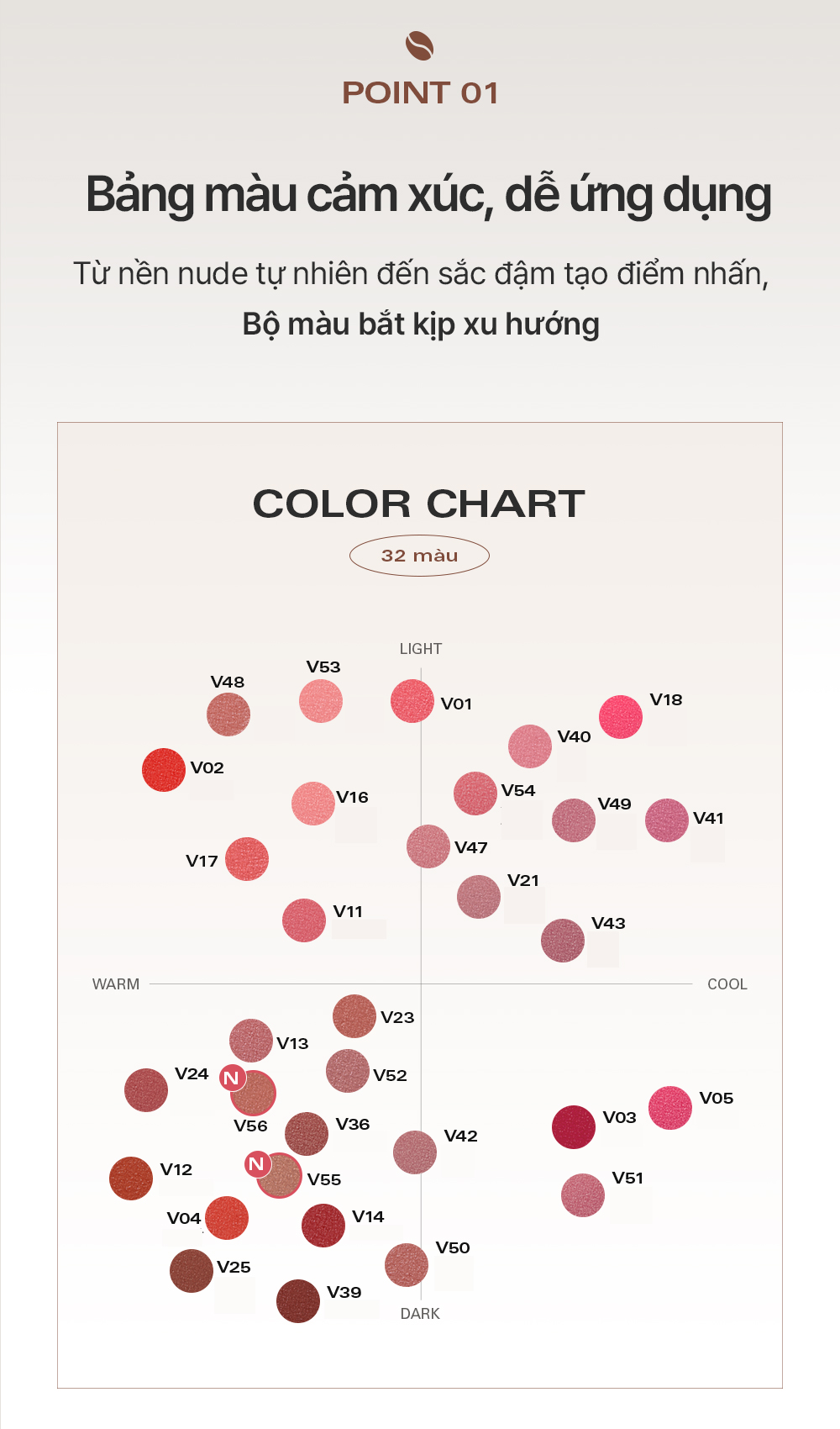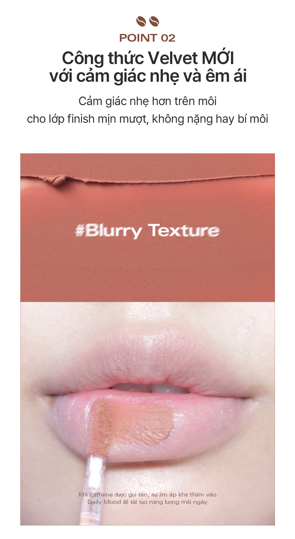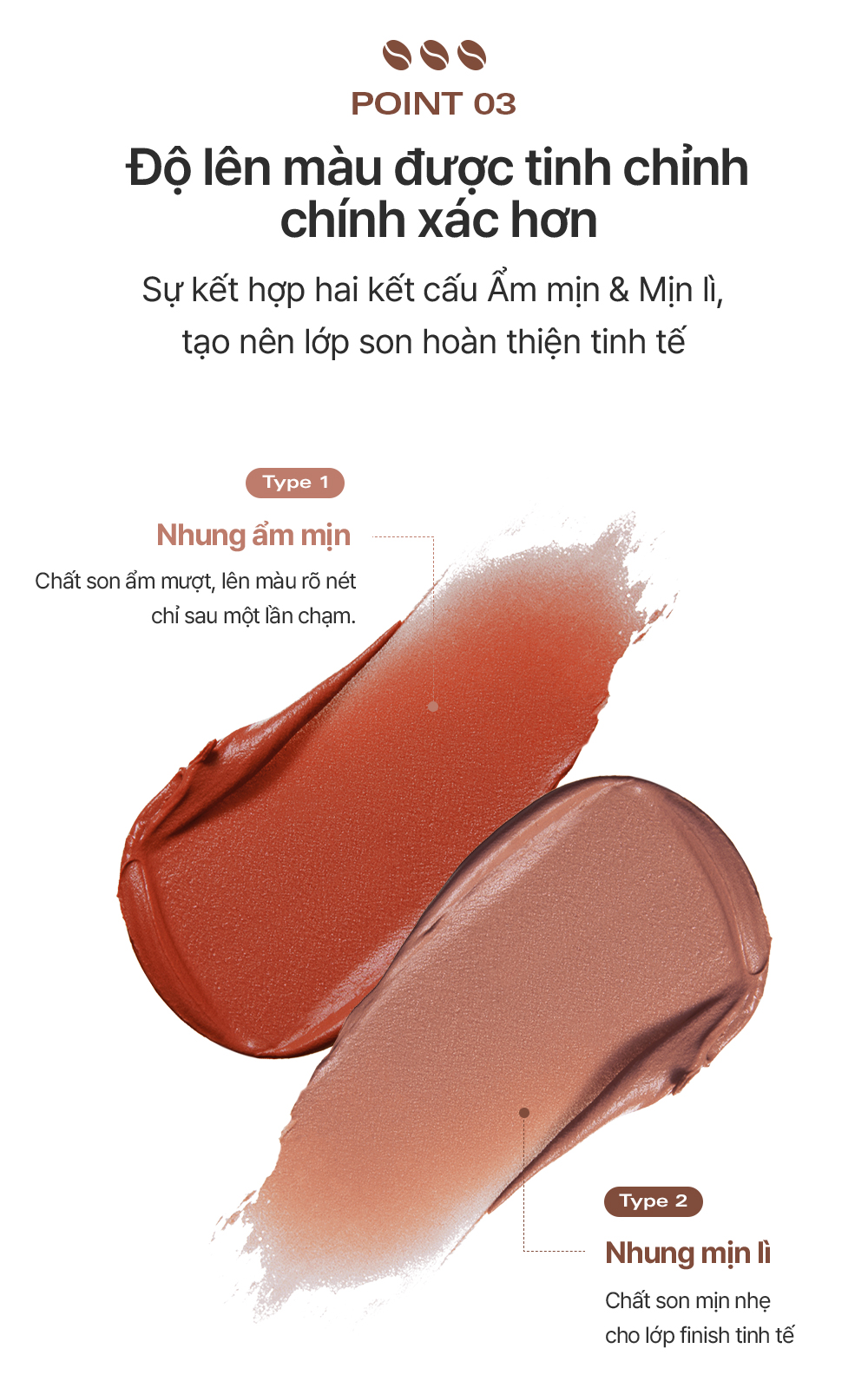 Kết cấu son Velvet cải tiến: nhẹ môi, mịn mượt như nhung, cải thiện độ bám và lên màu chuẩn