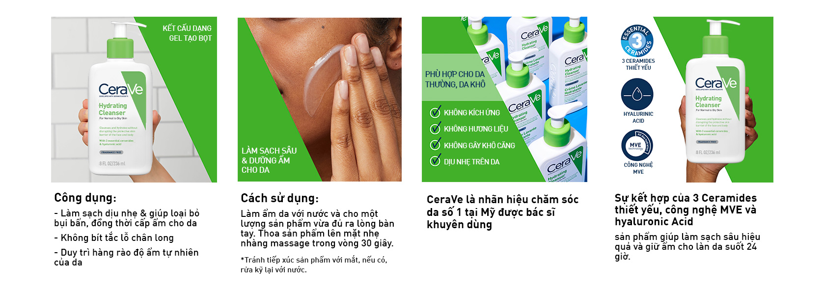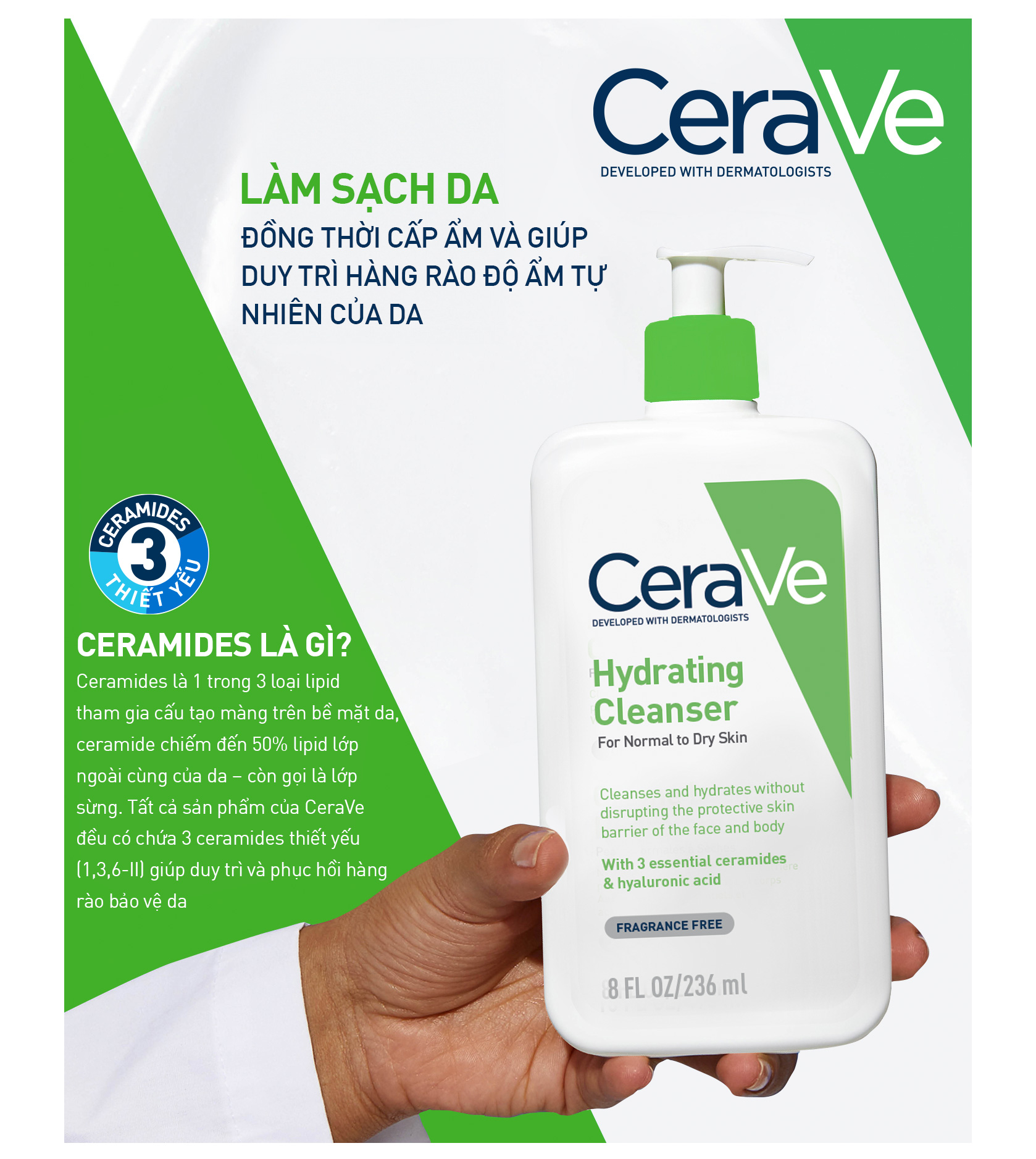 Với sự kết hợp của ba ceramides thiết yếu và hyaluronic acid, sản phẩm giúp làm sạch và giữ ẩm cho làn da mà không ảnh hưởng đến hàng rào bảo vệ da mặt và cơ thể.