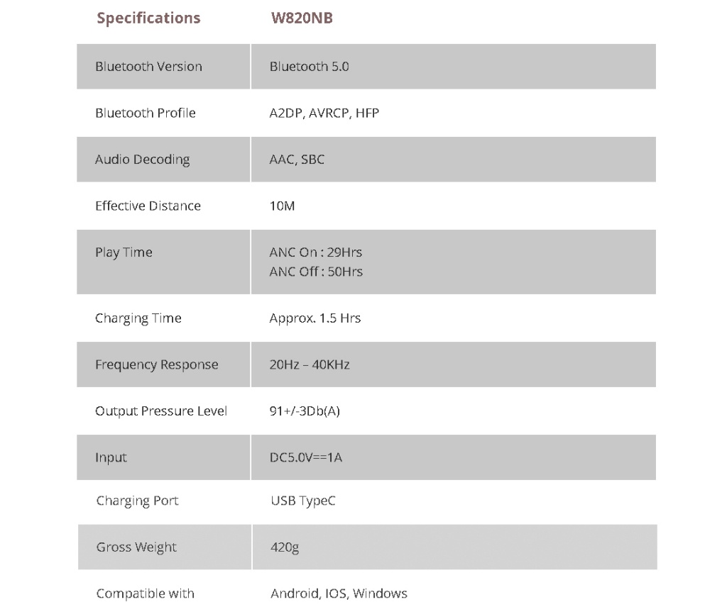 - Thời lượng pin nghe nhạc lên đến 50 tiếng ở mức 50% âm lượng, pin 29 tiếng ở mức âm lượng 50% ở chế độ chống ồn chủ động ANC.