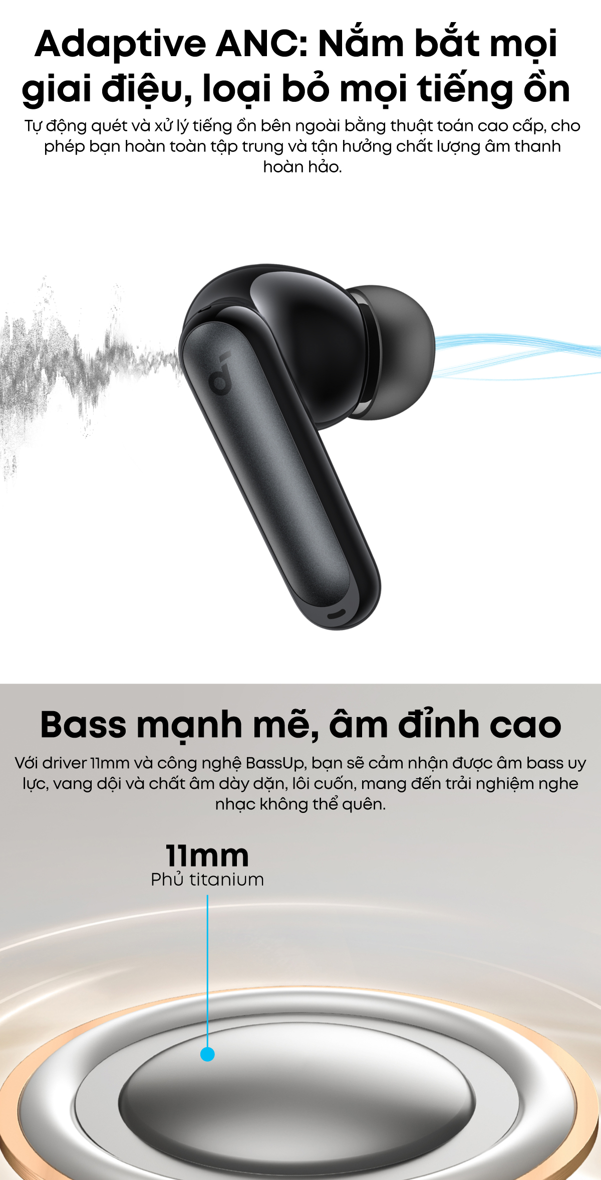 ✏️ Adaptive ANC: Với khả năng theo dõi tiếng ồn và công nghệ âm thanh không gian tiên tiến, mọi chuyến đi của bạn đều thật yên bình.