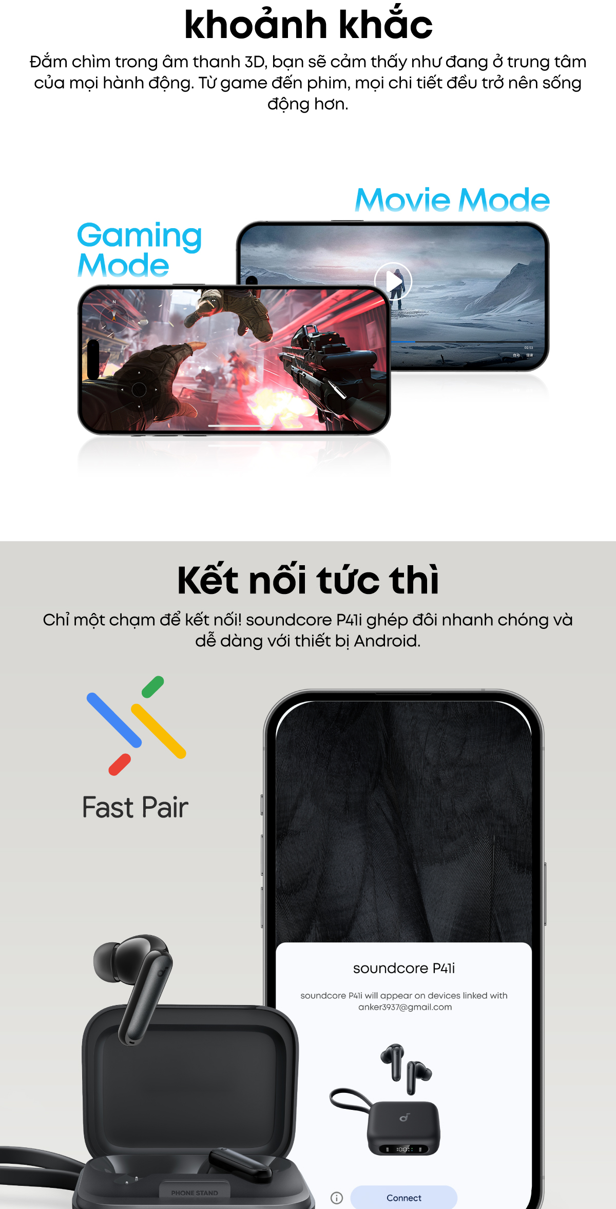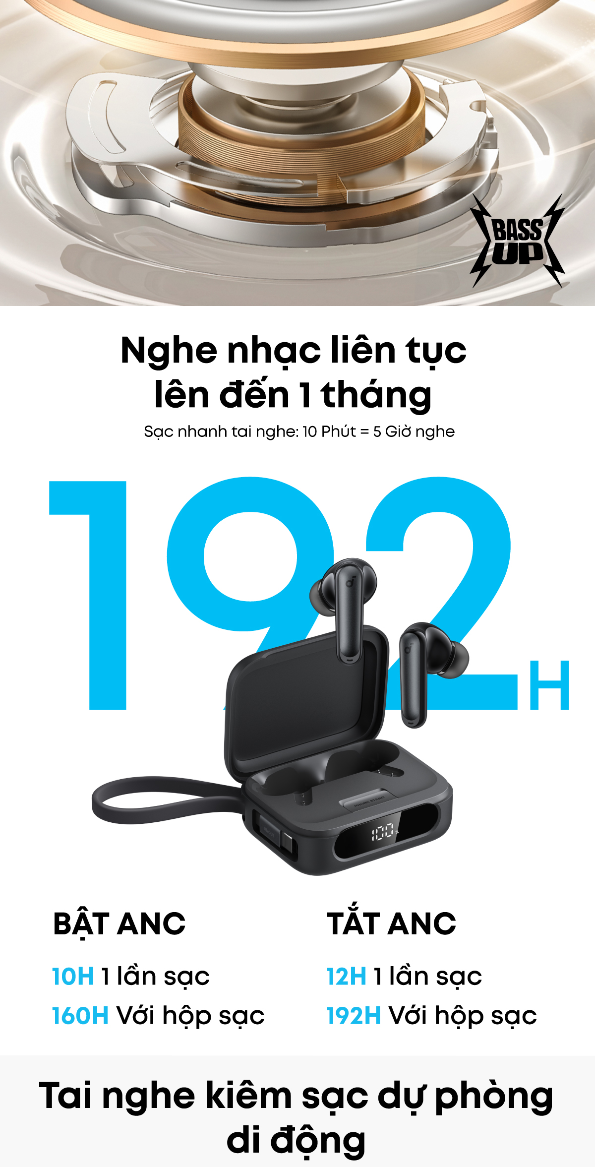 - Công nghệ: BassUp™, Adaptive ANC, Google Fast Pair