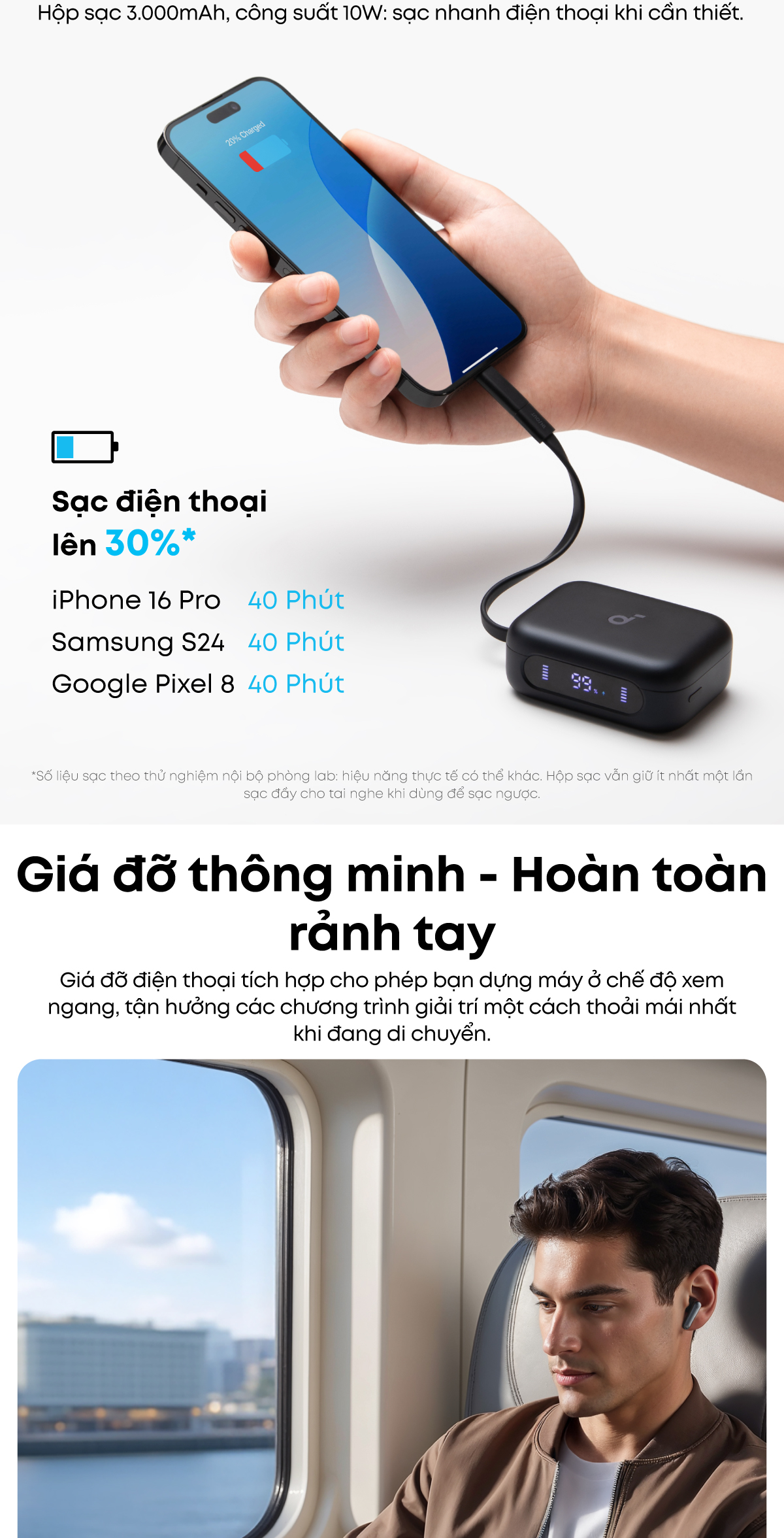 ✏️ Nghe & sạc mọi lúc mọi nơi: Thưởng thức âm nhạc liên tục và sạc dự phòng di động với hộp sạc 3.000mAh.