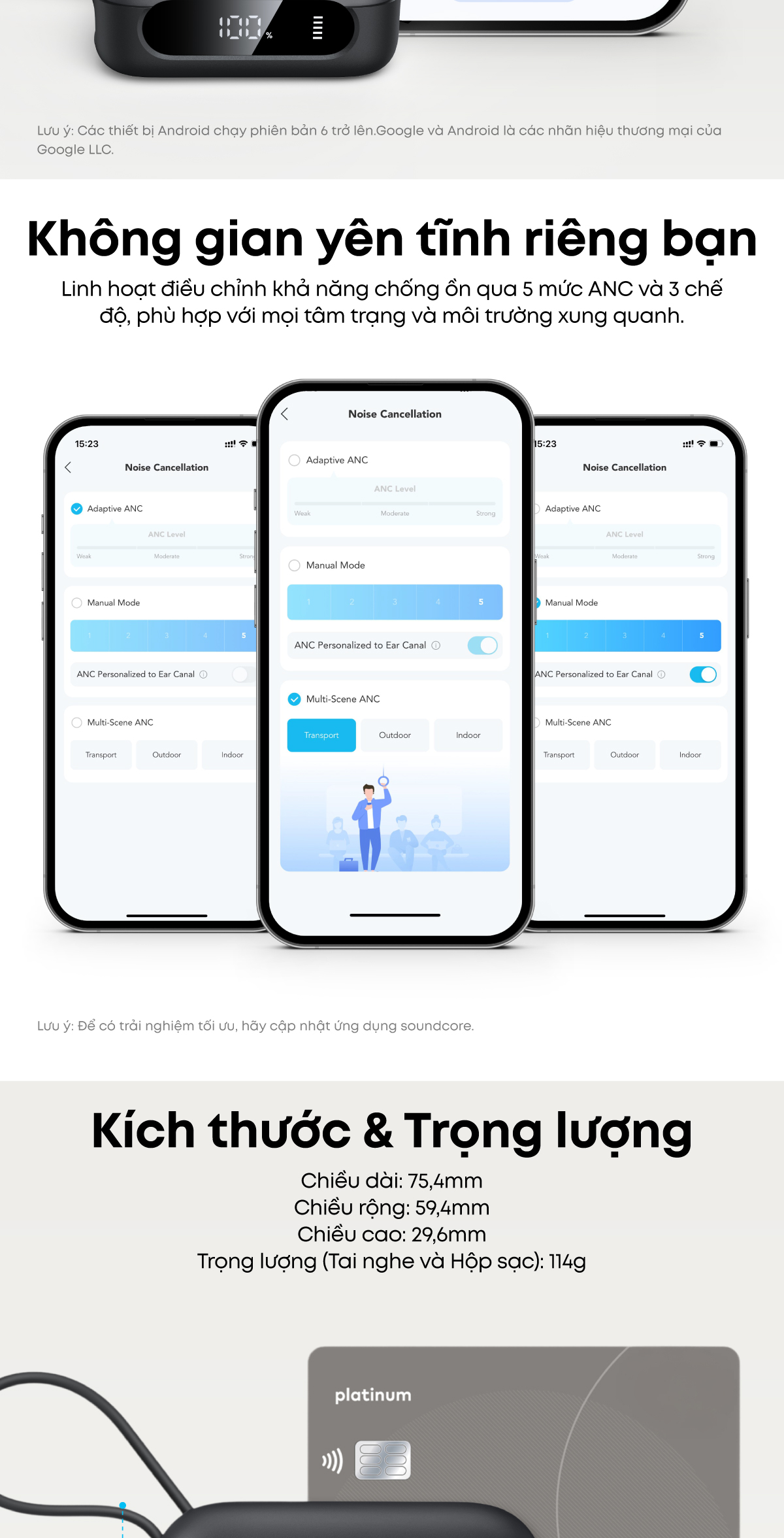 ✏️ Linh hoạt điều chỉnh khả năng chống ồn qua 5 mức ANC và 3 chế độ, phù hợp với mọi tâm trạng và môi trường xung quanh.