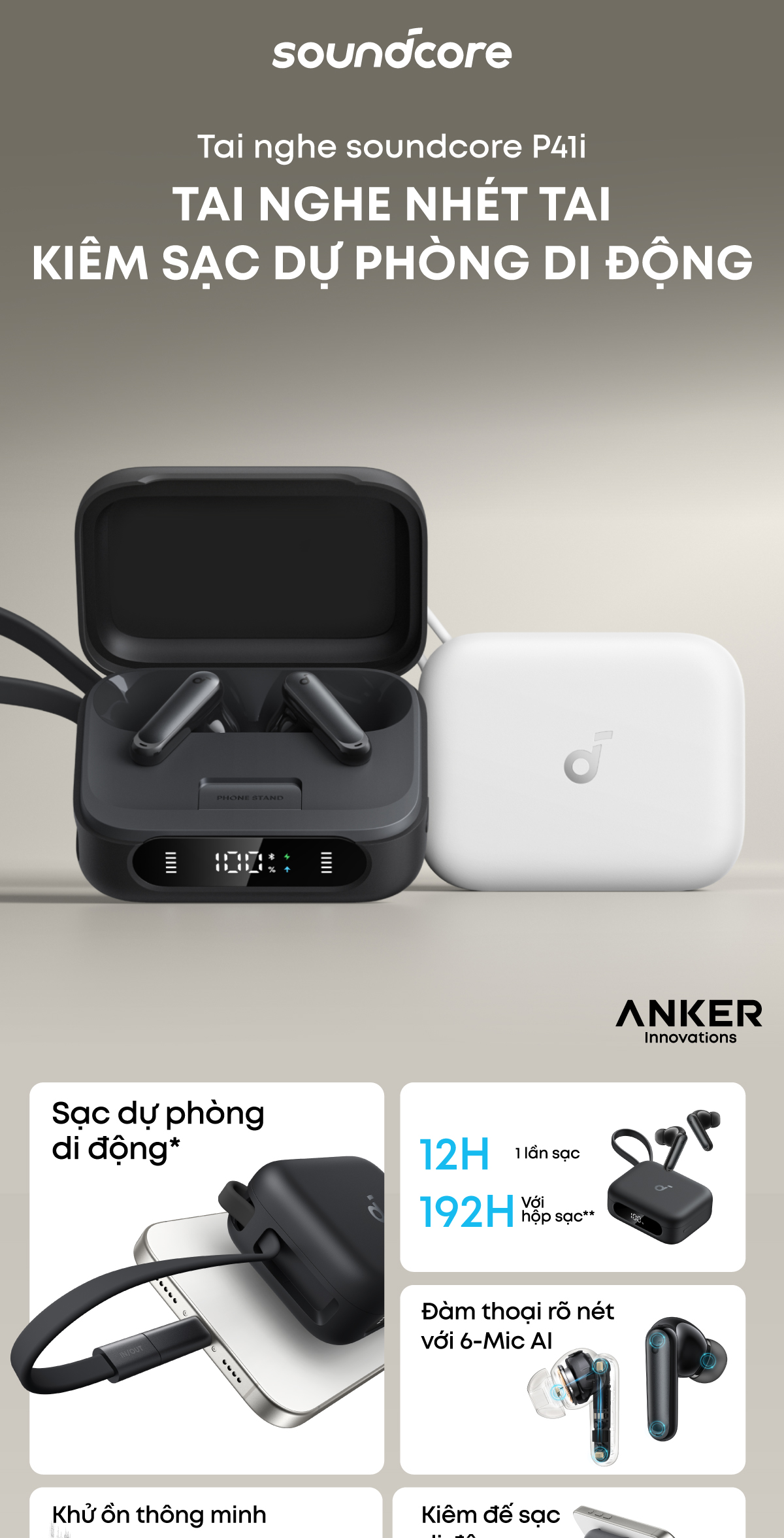 Tai nghe bluetooth kiêm sạc dự phòng Soundcore P41i | Pin 192h | Adaptive ANC | 6 Micro AI | Phiên dịch