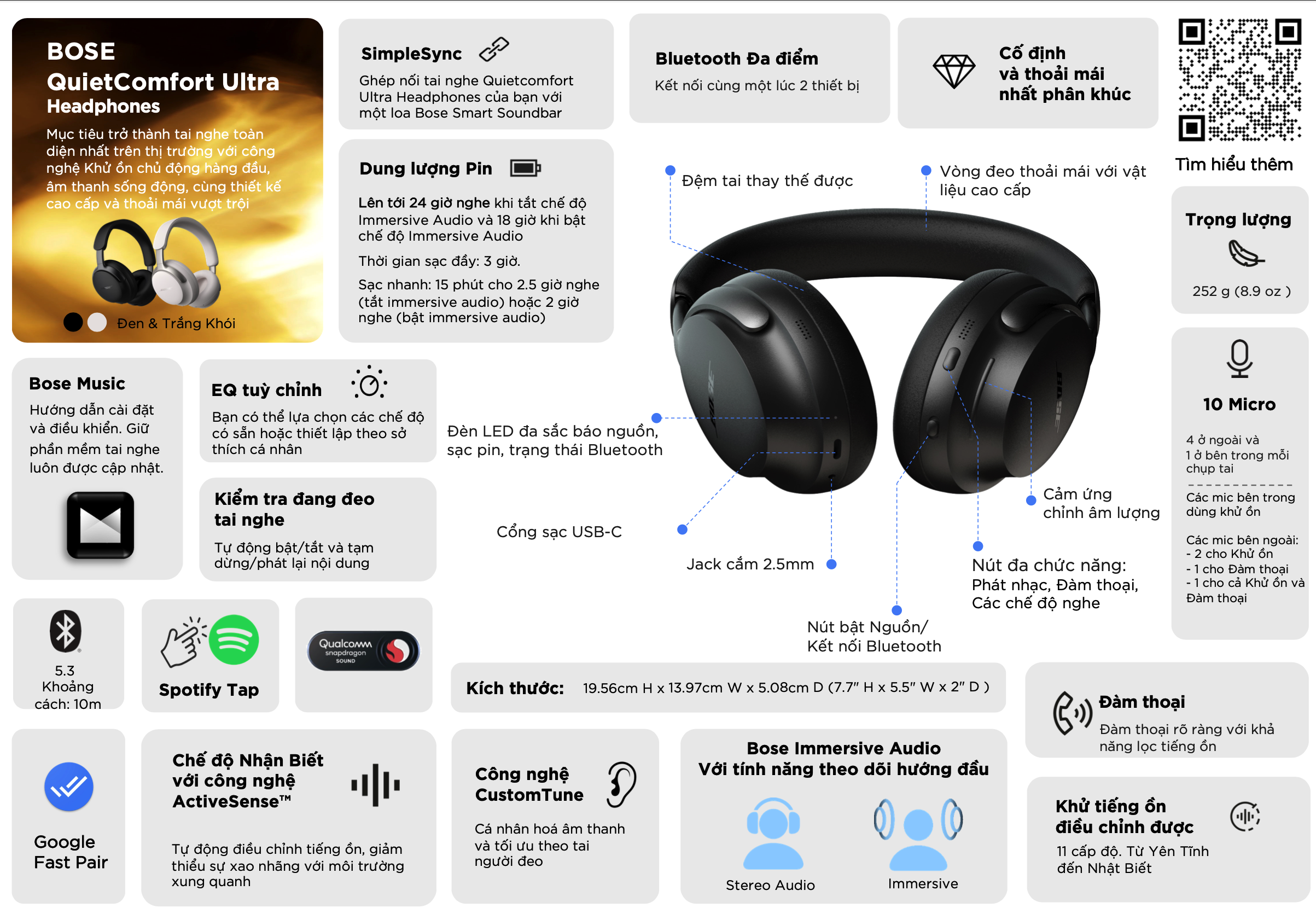 Tai nghe Bose QuietComfort Ultra Headphones| Immersive Audio| Pin 24H