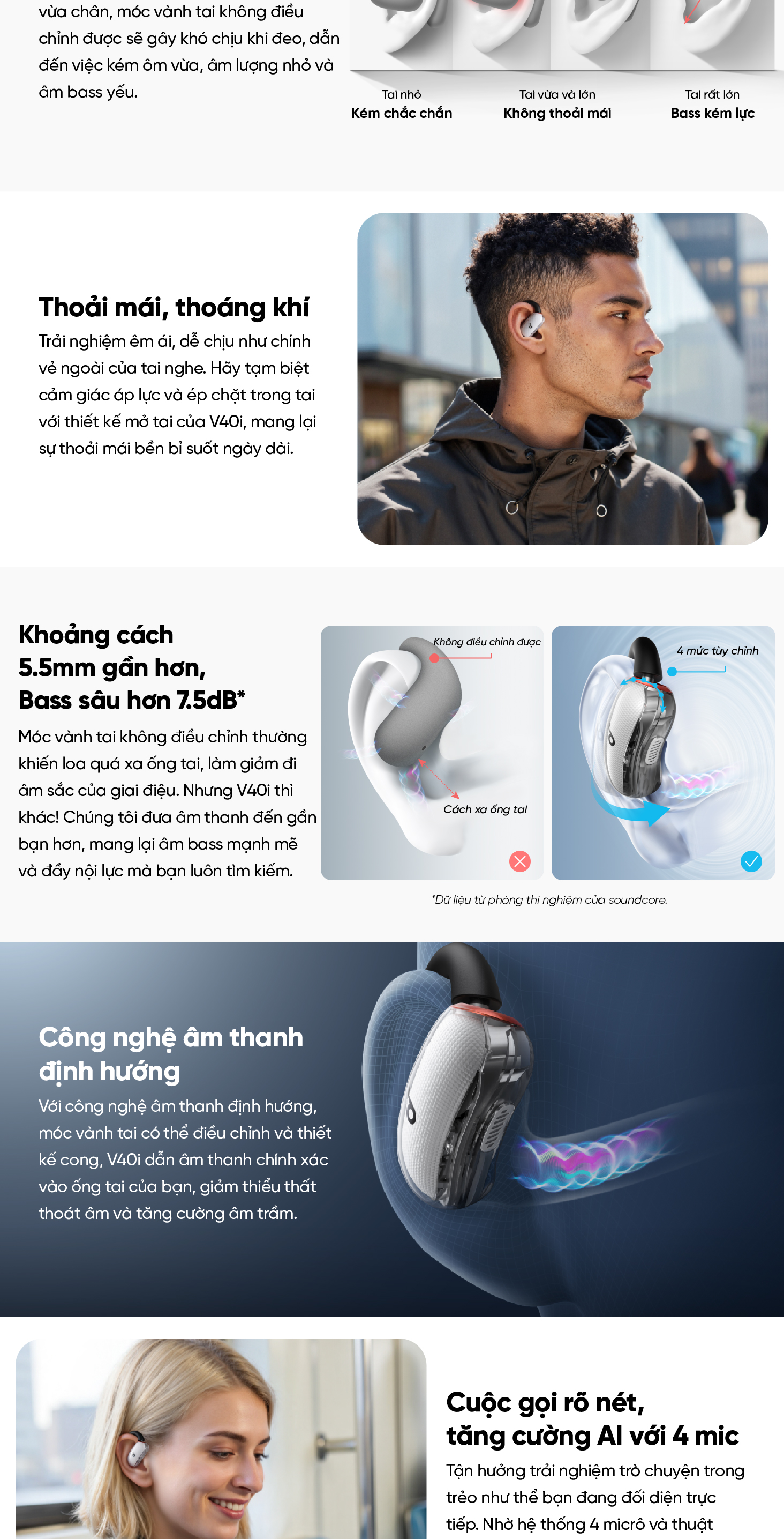 - Khoảng cách 5.5mm gần hơn, Bass sâu hơn 7.5dB: Móc vành tai không điều chỉnh thường khiến loa quá xa ống tai, làm giảm đi âm sắc của giai điệu. Với V40i, thiết kế đưa âm thanh đến gần bạn hơn, mang lại âm bass mạnh mẽ và đầy nội lực mà bạn luôn tìm kiếm.